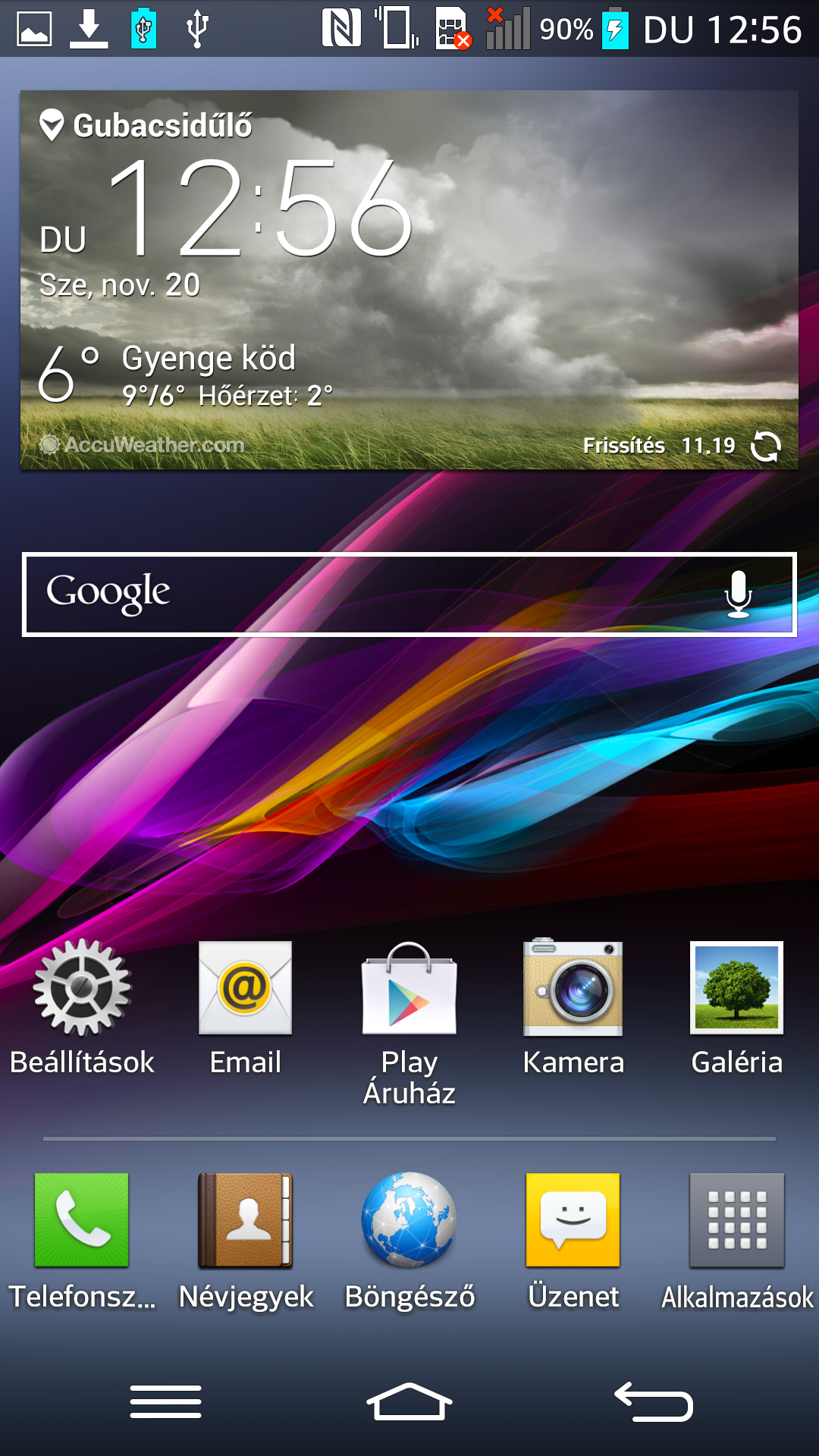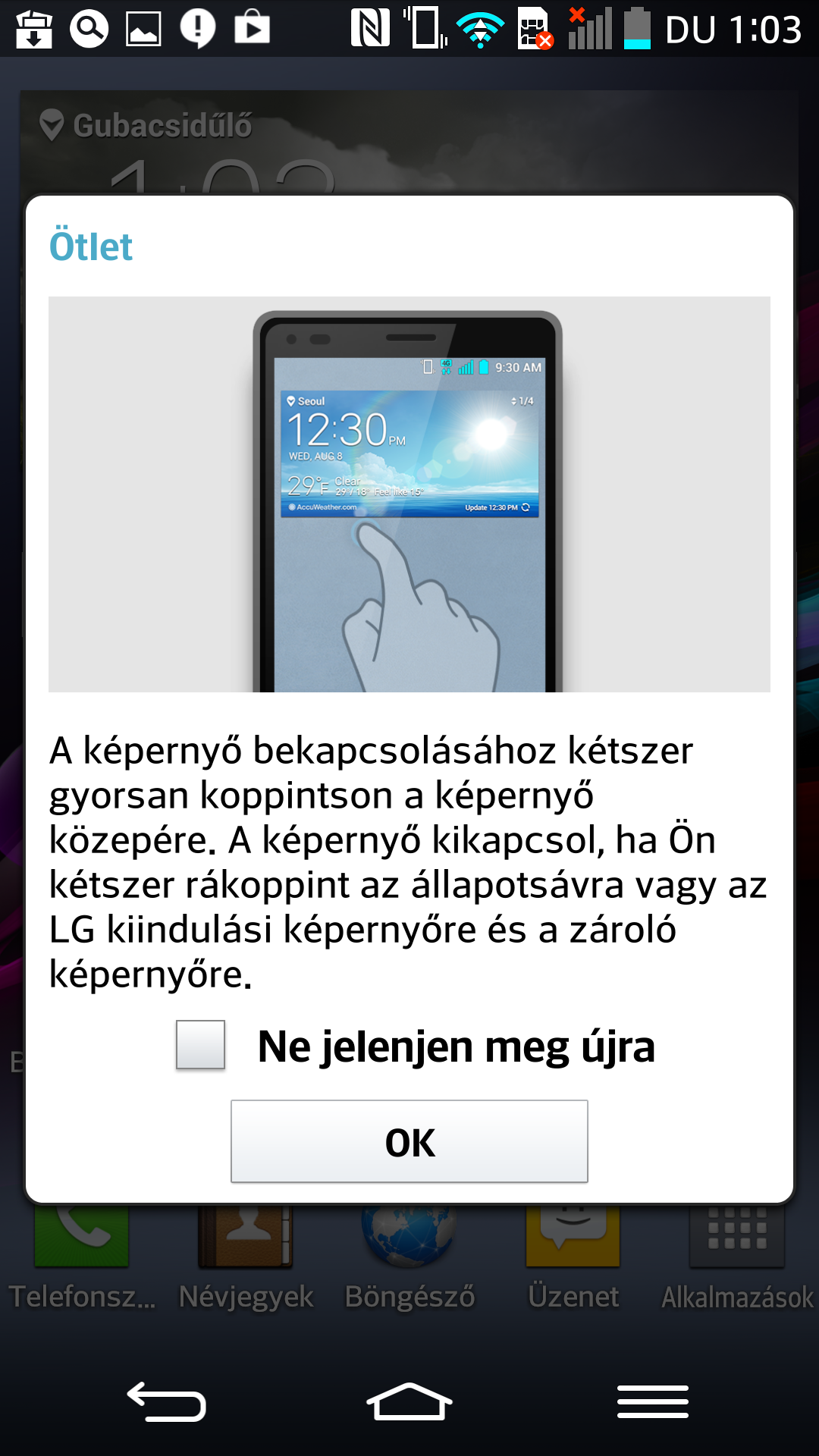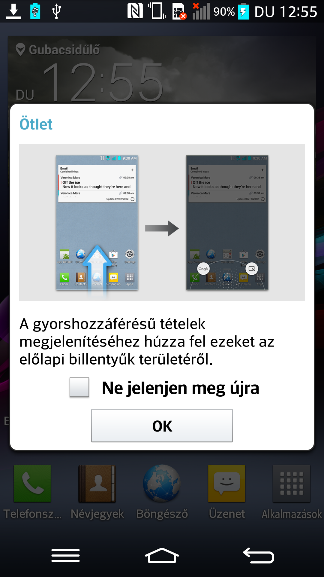 Kezdjük az alapoknál: a feloldó képernyő, amely lezárt állapotban is lapozható (balra a kártyácskák, jobbra a kamera található) nyomokban sem emlékeztet a gyári verzióra, ugyanis a készülék feloldásához elég, ha a kijelzőn bárhol, bármilyen irányba végig simítjuk az ujjunkat. A kijelző feloldását minden készülék esetében meg szokta előzni a bekapcsoló gomb lenyomása – a G2-ben azonban ezt kiválthatjuk úgy, hogy egyszerűen duplán koppintunk a kijelzőre. A dupla koppintás a lezárásnál is működik, a mérnökök tehát nem bízták a véletlenre, és nem kockáztatták meg, hogy tömegek azért forduljanak el a mobiltól, mert esetlen nem szimpatikus nekik a hátlapra áttelepített bekapcsoló gomb.