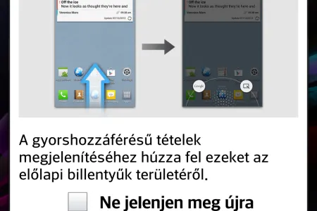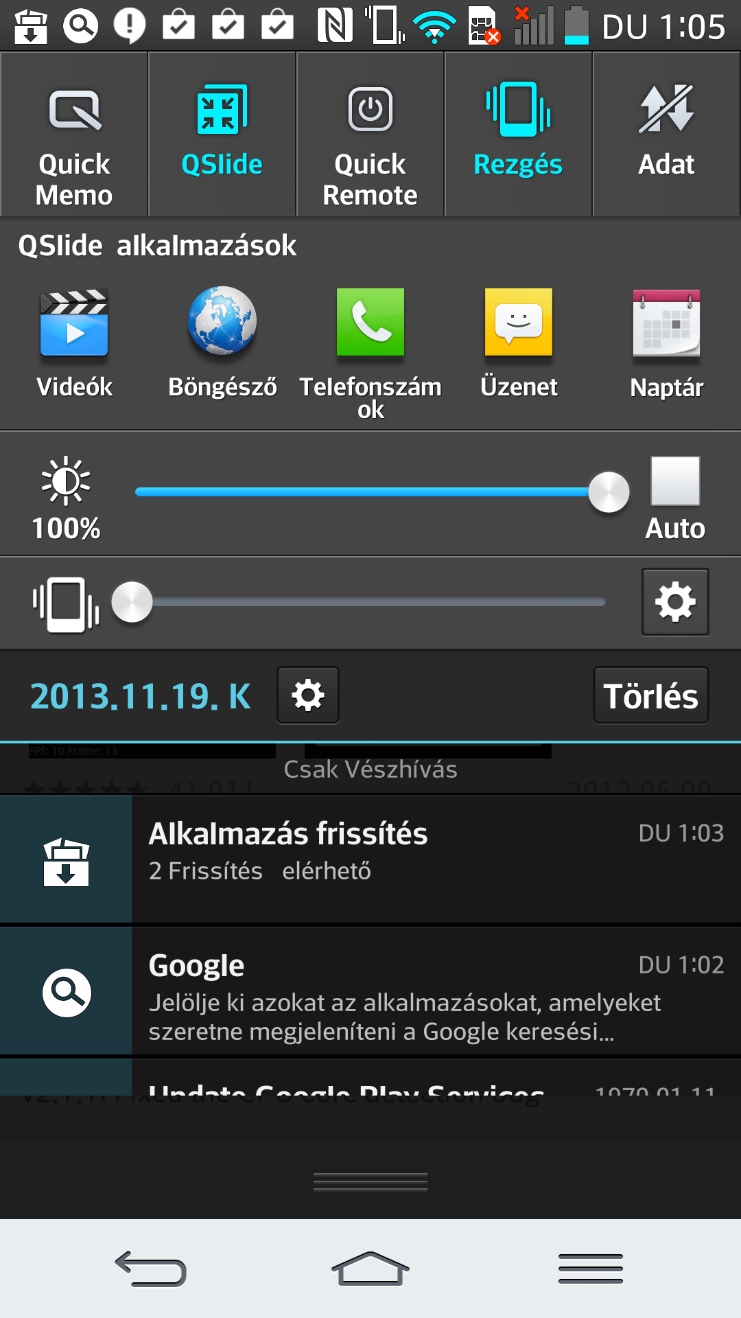 Az UI egyedüli gyenge pontja talán az állapotsáv, amelyen túl sok a kikapcsolhatatlan gyorsgomb. Alapesetben annyi van belőlük (kapcsoló, QSlide alkalmazások, fényerő, hang), hogy mindösszesen két értesítés látszik – és sajnos a QSlide kivételével a többi elemet ki sem lehet kapcsolni. Az interfésznek ez talán az egyetlen olyan eleme, amelyre azt mondhatjuk, hogy az LG jobban tette volna, ha nem változtatja meg az Android gyári megoldását (az Android 4.2-ben az állapotsávot egy ujjal lehúzva az értesítéseket látni, két ujjal lehúzva pedig a kapcsolópanelt).
