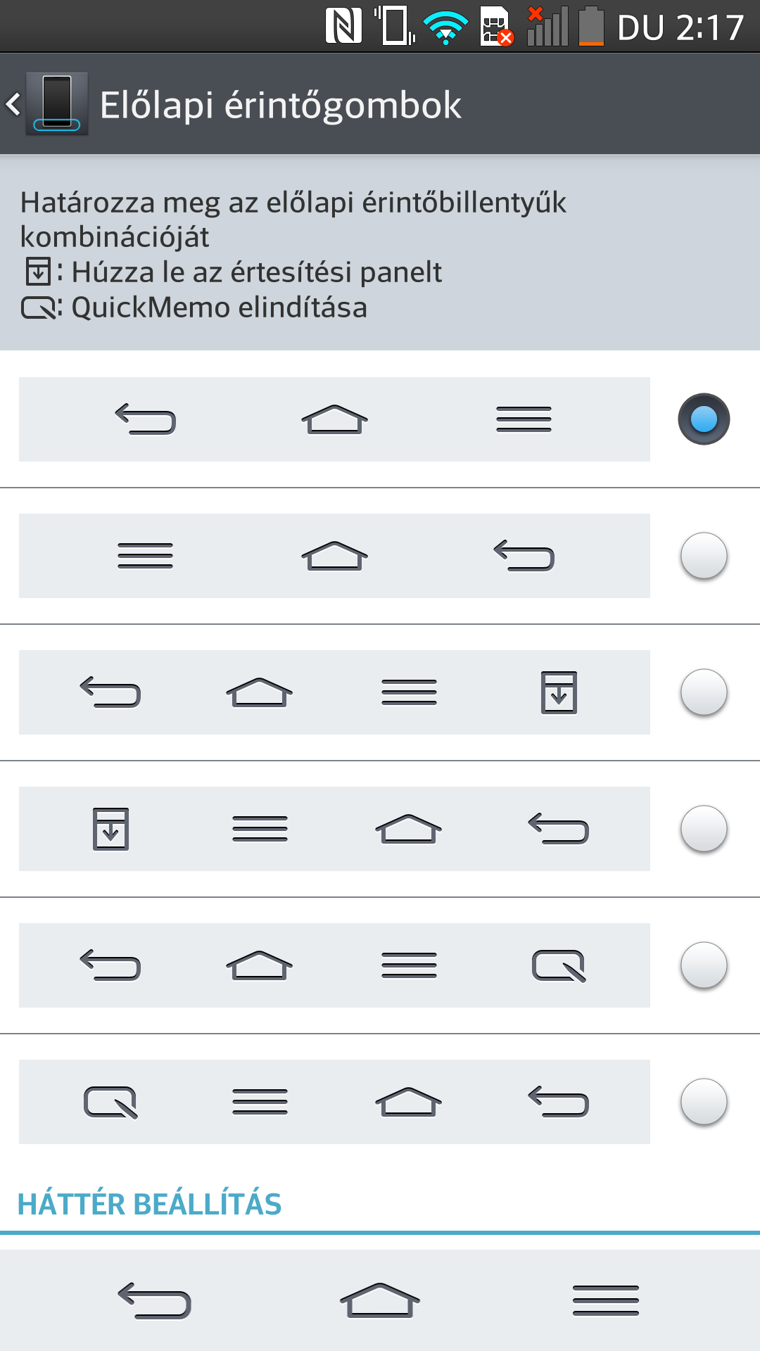 A testreszabási lehetőségeket az LG egyébként tényleg tökélyre fejlesztette, egészen jól paraméterezhető például a billentyűzet, és még azt is meg lehet adni, hogy a szoftveres gombok vissza/Home/menü vagy menü/Home/vissza sorrendben kövessék egymást. Sőt, a szoftveres gombok mellé betehetünk negyedikként egy állapotsáv lehúzót vagy a QuickMemo gombját is. A feladatkezelőnek külön gomb nem jutott, helyette a Home gomb hosszú megnyomásával lehet előcsalogatni, míg a Google Now elindításához lentről kell behúznunk az ujjunkat a kijelzőre.