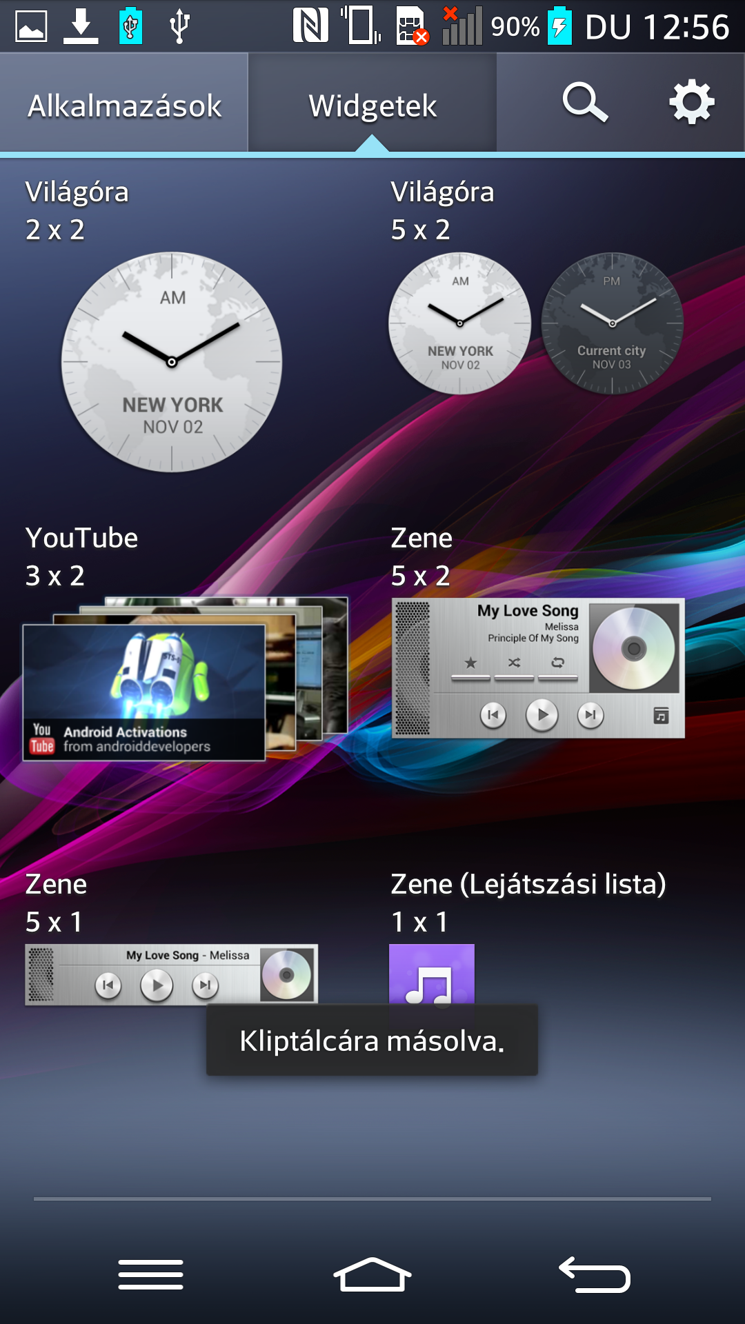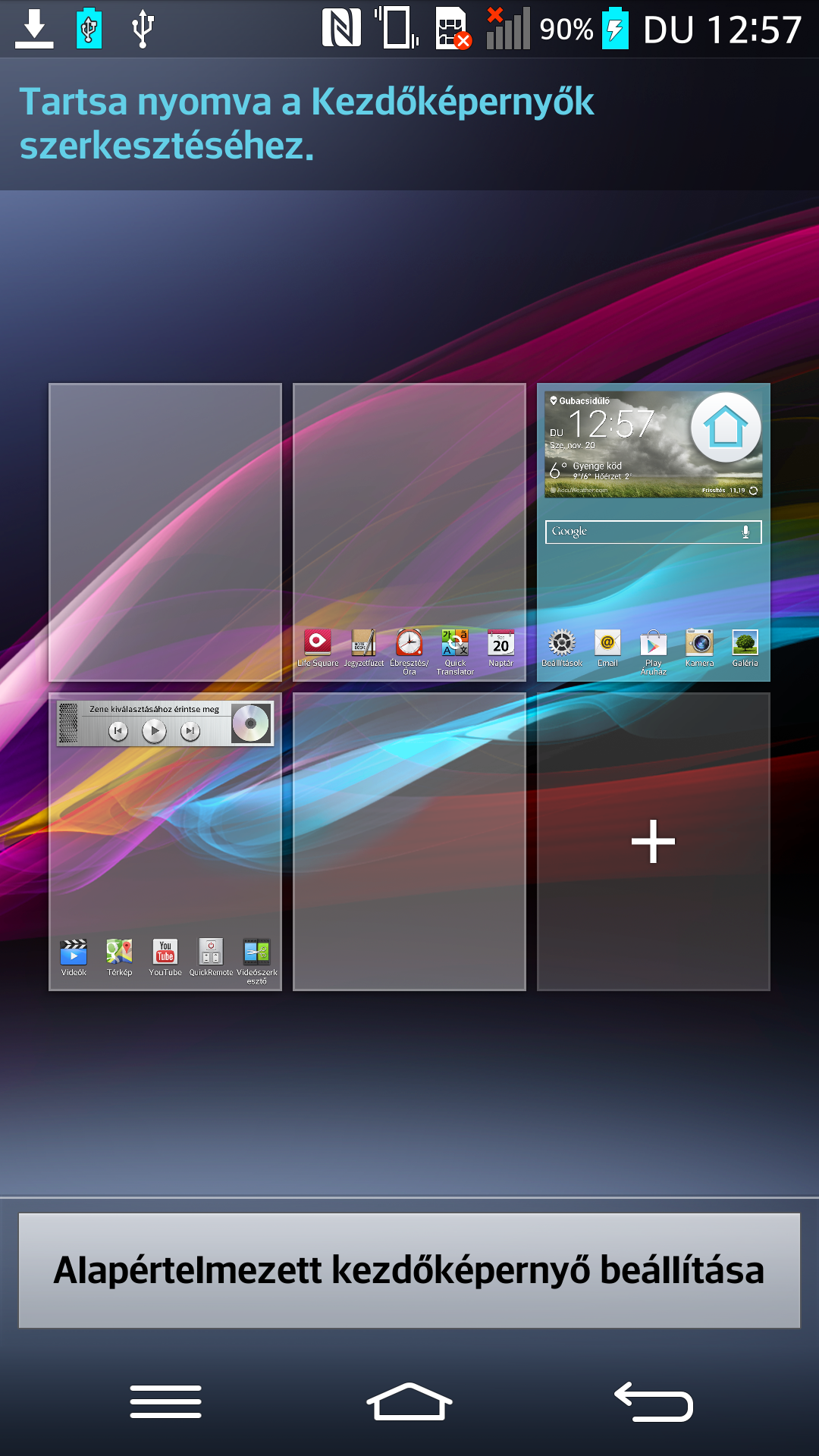 Kezdőképernyőből maximum hetet használhatunk. A felületen menedzseléséhez a csiptetős zoomot tudjuk használni, és természetesen van arra lehetőség, hogy az üres képernyőket teljesen eltávolítsuk. A panelek közötti átmeneti effekt látványos 3D-s, és az erős hardvernek hála tökéletesen folyamatos is – sebesség szempontjából talán a legjobb, amit eddig láttunk. Az átmeneti effekt egyébként cserélhető (a háttérben eltűnő helyett lapozó stílusú is választható például), de le is tiltható, mint ahogyan az alapesetben aktív körkörös görgetés is. Ha lehetne, kötelezővé tennénk azt az opciót is, amely szerint kérhetjük, hogy a telefon a kezdőképernyőt még az automatikus elforgatás bekapcsolása esetén is csak álló helyzetben mutassa.