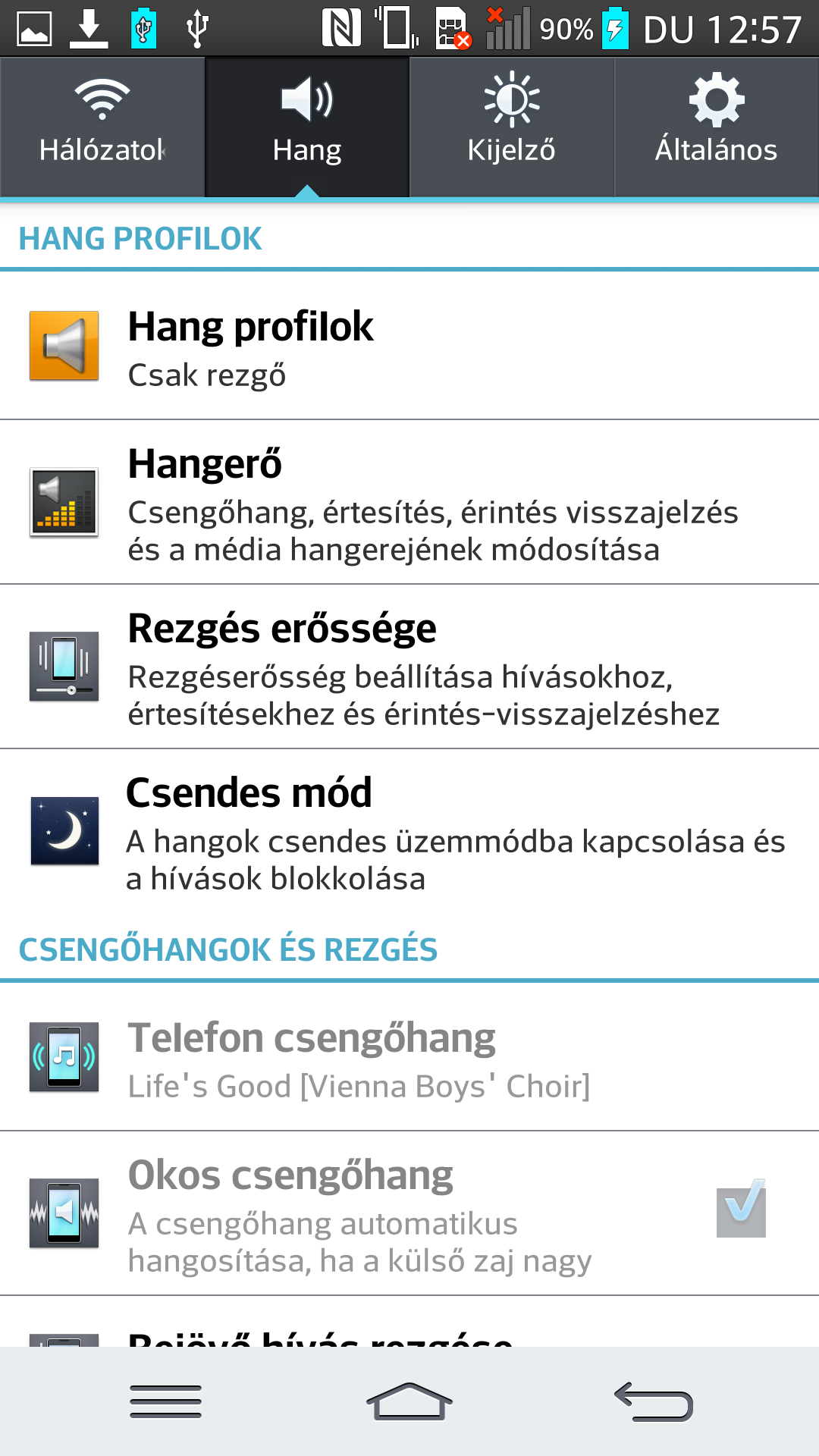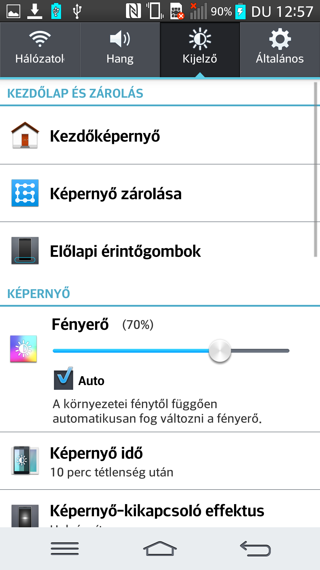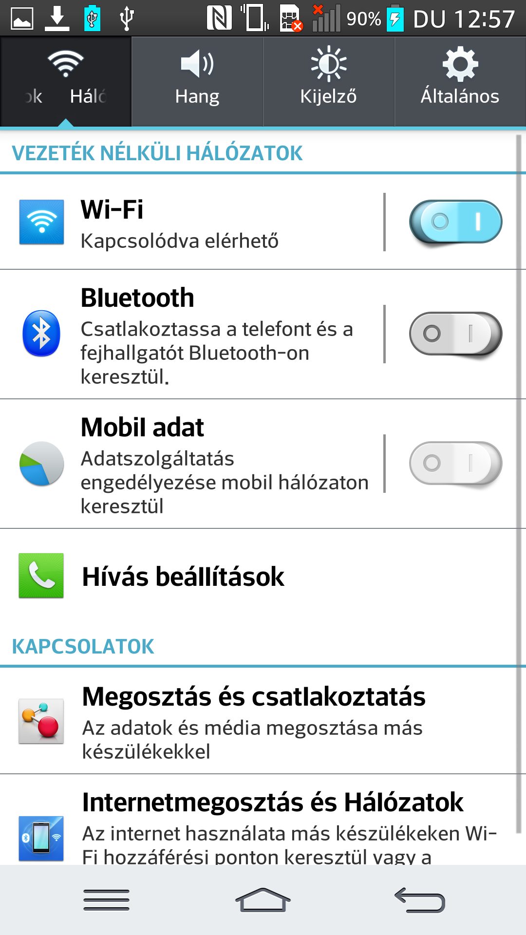 A beálltásokat az LG is négy nagy csoportra szedte szét (Hálózatok, Hang, Kijelző és Általános). Az elrendezés nekünk nem annyira szimpatikus, de tudjuk, hogy sokan kedvelik az efféle átalakítást – ez teljesen egyéni preferencia kérdése. Az kétségtelen, hogy a beállítások struktúrája nem rossz, minden opció ott van, ahol lennie kell, és mindenhol rengeteg a választás. Az LG fejlesztői azt az elvet követik, hogy inkább mindent beépítenek, legfeljebb kikapcsoljuk, ha nem kell valami, és ezt csak támogatni tudjuk.