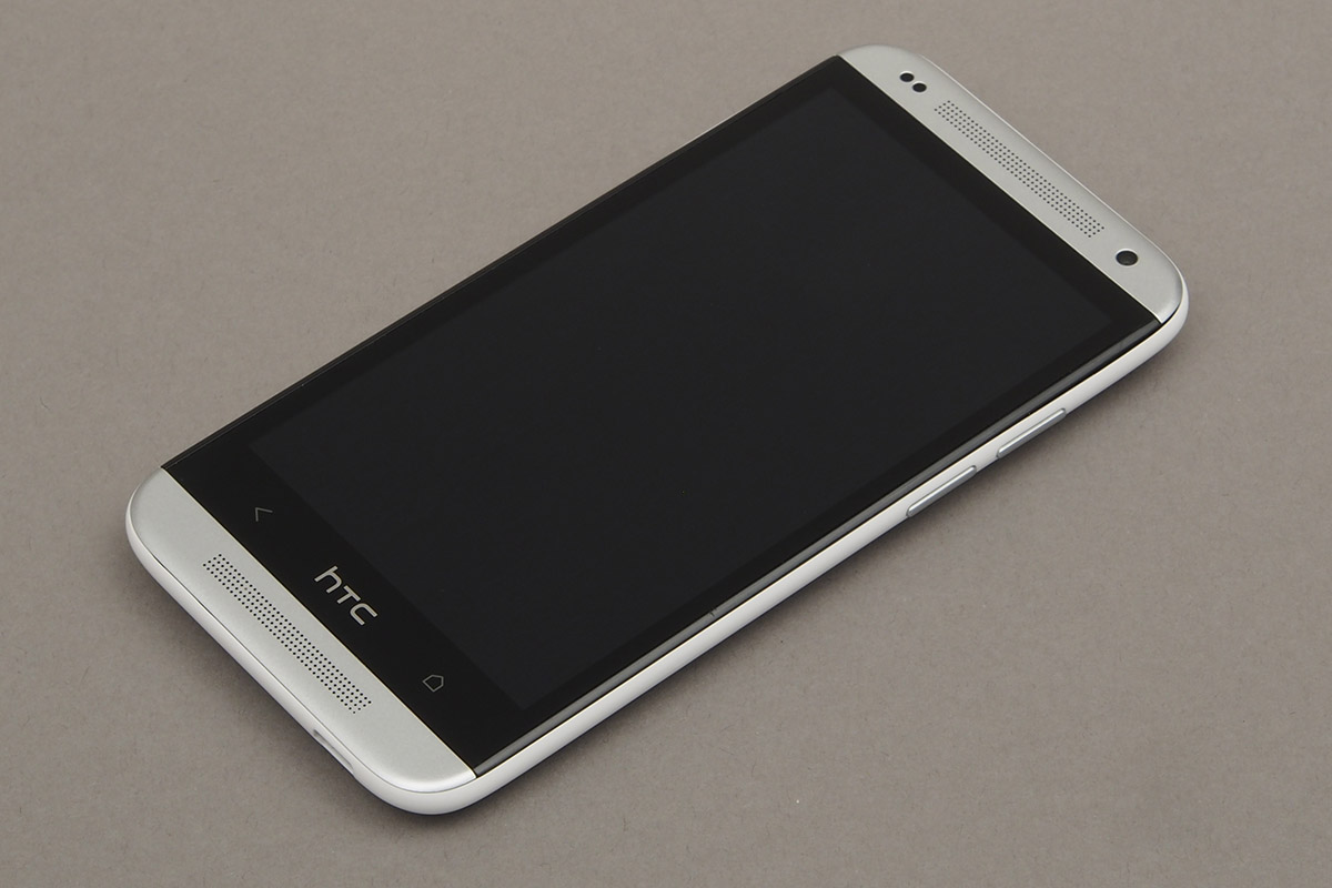 Az előlapot a kategóriában méretesnek mondható kijelző uralja. A Panel alatt a HTC felirat középen, a vissza gomb balra, a Home gomb pedig jobbra helyezkedik el – úgy látszik, hogy a vállalat nem akar tágítani a kétgombos elrendezéstől, ami valószínűleg azt jelenti, hogy a vásárlók összességében elégedettek a One kezelésével. A megjelenítő alatt és felett is egy-egy rácos betét látható; a felső a beszélgetés során használatos hangszórót rejti, lent pedig a külső hangszóró helyezkedik el. A kettő egyébként együtt is tud szólni, így a mobil sztereo hangzásra is képes. Felül a hangszórón kívül megtalálható a közelség- és fénymérő szenzor is, valamint a rácsok között elbújt egy állapotjelző LED is. A VGA felbontású videók rögzítésére képes előlapi kamera szintén ide került.