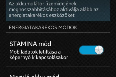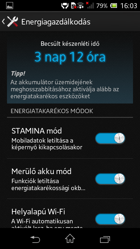 A hátlapot levéve egy 1750mAh-s Li-ion, cserélhető akkumulátor bújik elő. Ez ma már átlagos kapacitású telepnek mondható, ami ehhez a kijelzőhöz és hardverhez tökéletesen elég. Az egynapos üzemidő teljesen kipiálható, visszafogott használattal akár a két nap is megcélozható. Az Xperia M-ben a Sony telefonokban megszokott STAMINA mód is bekapcsolható, amivel azt akadályozhatjuk meg, hogy az alkalmazásaink készenléti állapotban is letölthessenek adatokat.