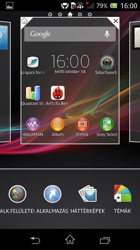Kezdőképernyőből összesen hetet használhatunk, amelyek mindegyikén az alsó sorban fixen két parancsikon, a menü gomb majd ismét két parancsikon található meg – az itt helyet foglalható alkalmazások természetesen változtathatók. A hét képernyő közül a feleslegeseket eltávolíthatjuk, és azt is kiválaszthatjuk, hogy a Home gomb megnyomásakor melyik panelre ugorjon a telefon. Az alkalmazásokat és widgeteket 4×4-es rácson helyezhetjük el, a rendszerezéshez pedig mappákat is használhatunk. A kezdőképernyők átrendezéséhez, megtöltéséhez használatos felület remekül működik, és van néhány téma is, amelyek segítségével a megjelenést testreszabhatjuk.