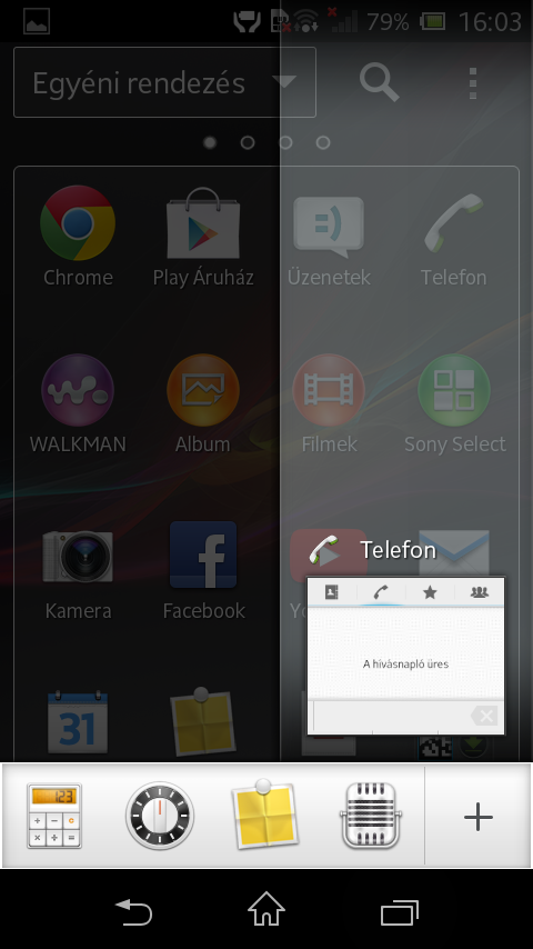 A Sony az alap, telefonáláshoz szükséges alkalmazásokon nem sokat változtatott, de már eddig is teljesen komplett csomagot kaptunk, így ez természetesen nem jelent semmi gondot. A Kapcsolatok alkalmazáshoz nem férünk hozzá közvetlenül, mert alapesetben nincsen parancsikon a főképernyőn, de ezt egyrészt pótolni sem nehéz, másrészt a telefon részlegből is egyetlen kattintásra vannak csupán kapcsolataink. Az Xperia M Google és Facebook fiókokból is tudja importálni a kontaktokat, és ezeket a fiókokat később természetesen folyamatosan karban is tartja. A Kapcsolatok alkalmazásból a névlistán kívül a hívásnaplót és a csoportokat is elérjük külön, a gyorskeresésben pedig a jobb oldalt elhelyezett betűoszlop segít – de természetesen működik a Smart Dial funkció is. Az SMS-eket a telefon a megszokott, párbeszédes formában jeleníti meg. A teszt során a hangminőséggel nem volt problémánk.