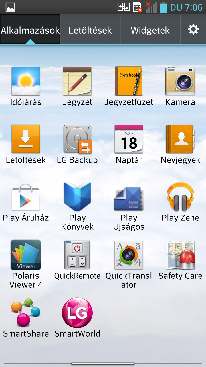 Az LG a fontosabb Google alkalmazások közül Chrome-ot, a Google+-t, a Hangalapú keresést, a Hangoutsot, a Localt, a Play Zenét, a Térképet és a YouTube-ot választotta, míg a (részben) saját és harmadik gyártótól származó alkalmazások táborát a Galéria, az Időjárás, az LG Backup (biztonsági mentés készítése a felhőbe), a Quick Remote (univerzális távirányító), a Videók és Videoszerkesztő, a Zene, a Feladatkezelő, a Polaris Viewer (Office dokumentumok megtekintéséhez), a Quick Translator (kamerával működő online fordító, angolról számos nyelvre és egészen jól működik), a SmartShare (DLNA), a SmartWorld (saját piactér) és a Szótár (offline, egy szótár ingyenes, a többi megvásárolható – magyarul ez sem tud) jelentik.