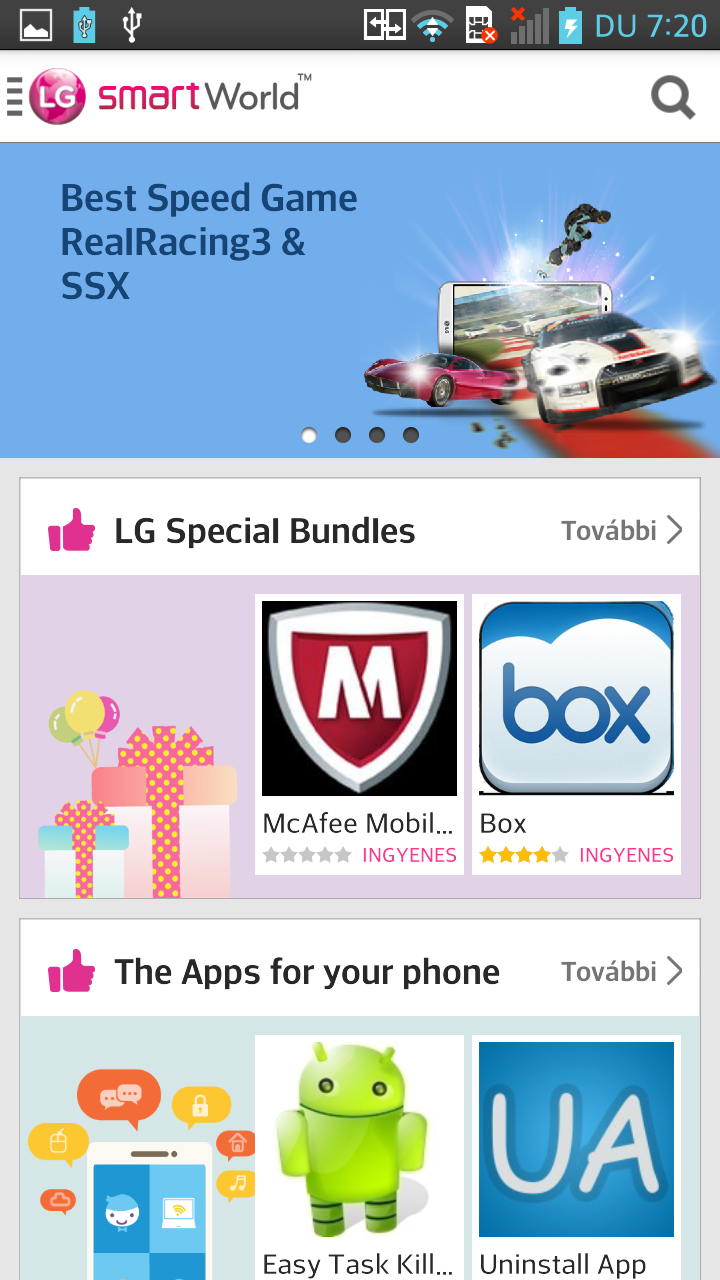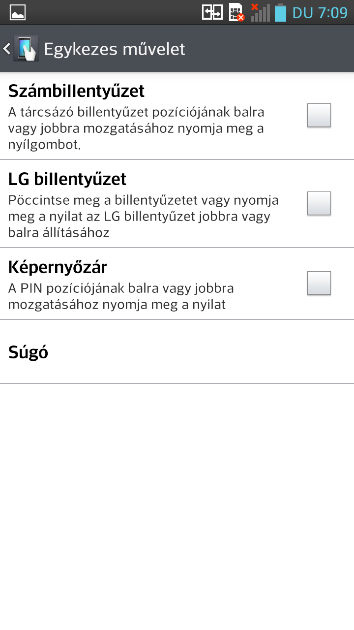 A saját UI elég egyszerűen átlátható, és szerintünk jól is néz ki a szoftver, valamint az is örvendetes, hogy nincsen benne teljesen felesleges (öncélú) dolog sem. Fontos még az is, hogy ebben a modellben már van intelligens képernyőzár, azaz a telefon az első kamera segítségével próbálja érzékelni, hogy éppen nézzük-e a képernyőt vagy sem – ha igen, akkor természetesen nem zárja le magát a készülék. Az Optimus UI ötletes megoldása az egykezes használat, amely nemcsak a tárcsázáshoz használt gombokat, hanem a gépeléshez használatos klaviatúrát is tudja úgy rendezni, hogy a teljes területet elérjük a hüvelykujjunkkal. Fektetett mobilnál a gépelést ugyanakkor azzal tudjuk meggyorsítani, hogy a gombokat a telefon ketté választja, és a két sarokba rendezi.