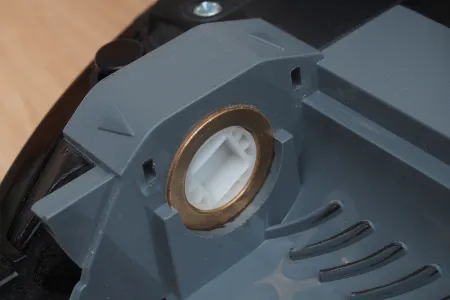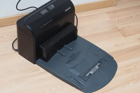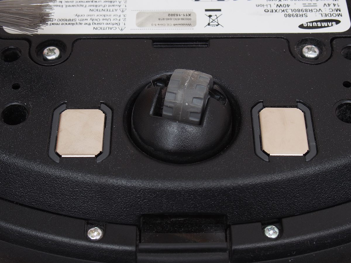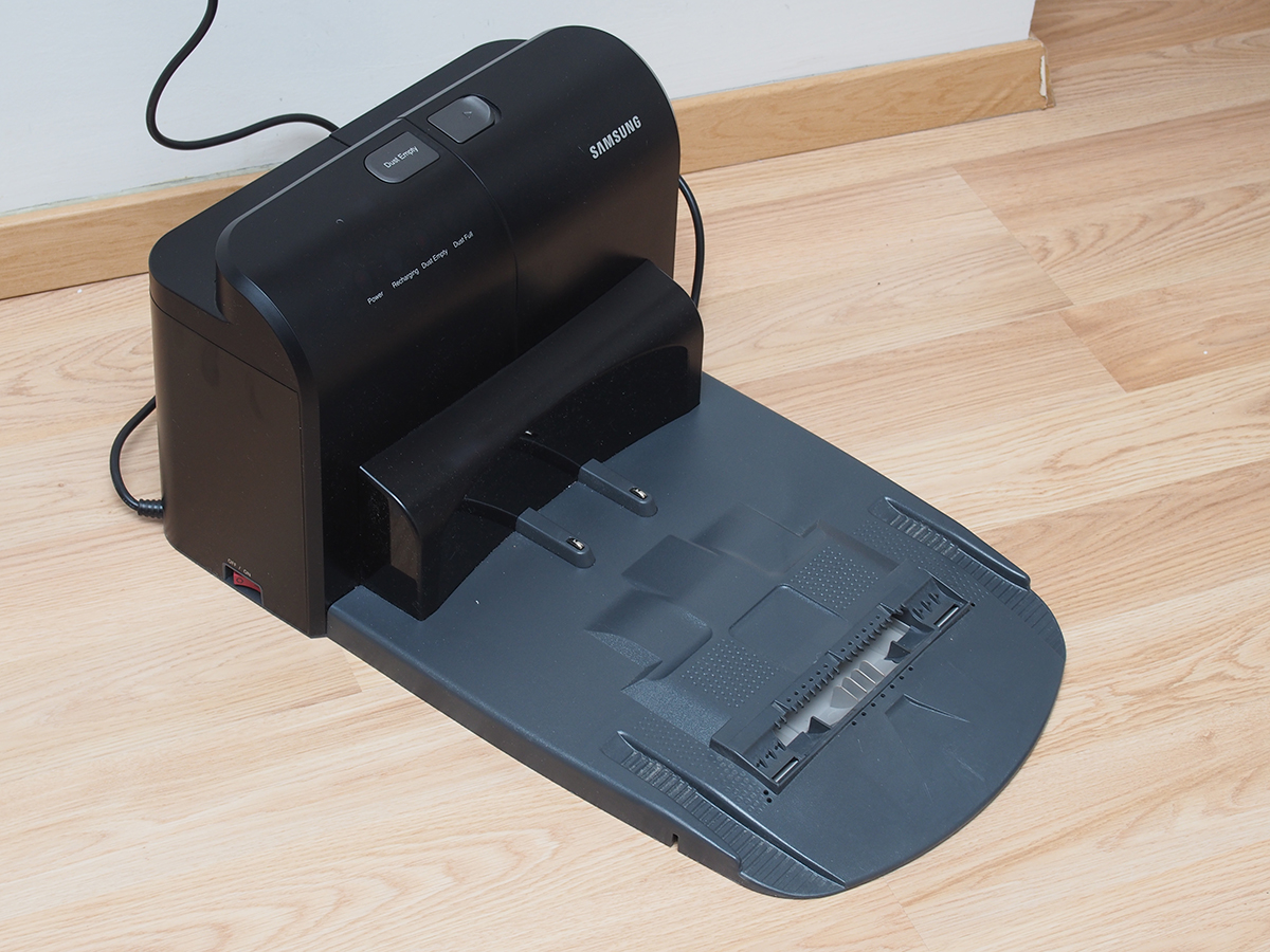 Ahogy azt már sok koreai robotnál láttuk, nem nagyon van rajta a készüléken légkivezető nyílás. A dolog teljesen érthetetlen, hiszen a beszívott levegőnek valahol távoznia is kell a készülékből. Ezt a Samsung az elemek illesztésénél oldja meg, ami lássuk be nem utal túl nagy légmozgásra. A kivett portartály mögött a vázon egy elhúzható szürke ajtó egy csatlakozót rejt. A pontos funkciója nem ismert.