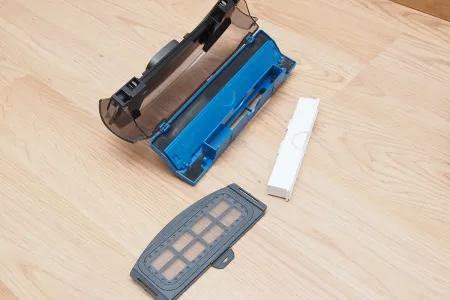 A portartály az iRobot Roomba modellekhez hasonlóan a robot hátuljára került, de koncepciója és kialakítása is teljesen eltér attól. A legfontosabb, hogy a tartályban nincs szívómotor, így az akár vízzel is kimosható az elektromos alkatrészek megrongálódásának veszélye nélkül. A vákuum motor a robot besejébe került, ami a tartályon keresztül szívja a levegőt. A tartály felső vékony szeletét egy durva szűrő (inkább finom háló) választja le az alsótól. A levegő ezen keresztül távozik, a szűrő pedig összeszedi a nagyobb szennyeződéseket, így azok már nem torlaszolják el a HEPA szűrőt. A felső szegmensből a HEPA szűrőn vezet az út a robot belseje felé. A portartály méreta 0,3 liter, ami ugyan nem sok, de egy takarításra bőven elég. Dokkolás után pedig a szemét úgyis a dokkoló nagyobb tartályába távozik, így ennél nagyobb tartályra ennél a robotnál semmiképp sincs szükség. Ez a felépítés véleményünk szerint nagyon jó, egyedül a szívómotor teljesítményével nem vagyunk kibékülve, de erről majd később.