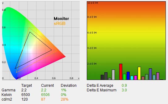 Ahogyan azt megszokhattuk, a kijelző által lefedett színtér nagyjából az sRGB színtér 60 százalékát fedi le. Alapesetben a panel színhelyessége sem túl jó a maga 3,5-ös átlagos deltaE értékével, azonban, mivel PC-ről van szó, lehetőség van a (szinte) teljesen tökéletes kalibrációra – aki hajlandó elvinni készülékét és bekalibráltatni, az simán dolgozhat 1 alatti átlagos deltaE-vel rendelkező, gyakorlatilag színhelyes kijelzővel. Kalibrált állapotban 597:1-es kontrasztot mértünk, ami elsősorban annak köszönhető, hogy a notebookok kijelzői a feketében általában nem jeleskednek – és ez ezúttal is így volt.