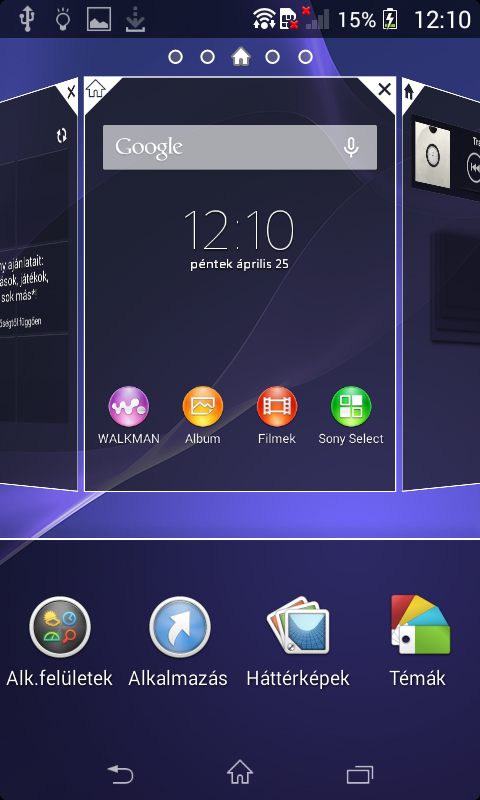 A lezáró képernyőt az ismerős, felfelé vagy lefelé irányuló simítással oldhatjuk fel, a dologban annyi trükk van, hogy csak a kijelző alsó felét használhatjuk a feloldásra, mert a felső harmadban az Android 4.2-nél bevezetett widgetek kaptak helyet. Alapesetben az órát látjuk itt, de ez cserélhető bármilyen alkalmazásfelületre. Ha jobbra lapozunk, akkor a fényképezőt indíthatjuk el, míg balra további üres lapokat találunk, amelyeket tetszőlegesen tölthetünk meg. A Sony extrája, hogy az értesítési sáv is lehúzható a telefon lezárt állapotában, így csak azért nem kell feloldani a mobilt, hogy a WiFi-t vagy a Bluetooth adaptert ki- vagy bekapcsoljuk, esetleg megnézzük, hogy ki küldött SMS-t.