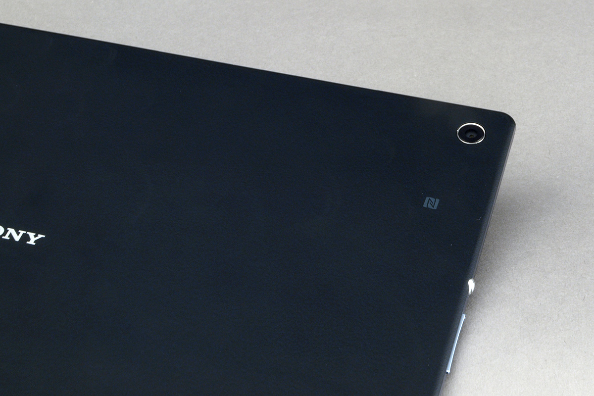 A hátlap kellemes tapintású, matt műanyagból készült, így túlságosan nem gyűjti az ujjlenyomatokat. Az Xperia felirat mellett a hátsó részre került a fő kameramodul, talán a lehető legrosszabb helyre, az egyik sarokba – nem nehéz úgy kézbe venni a tabletet, hogy legalább részben eltakarjuk az objektívet. A hátlapon találunk még egy NFC logót is, a piktogram azt jelzi, hogy hol helyezkedik el a chip.