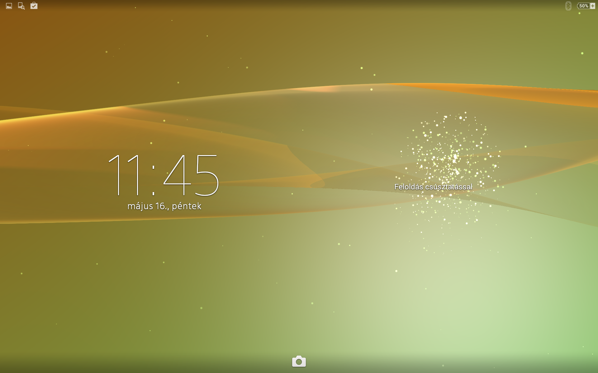 A lezáró képernyő bal oldalán az óra, jobbra pedig az a felület látszik, amit a feloldáshoz használhatunk. Az Androidban a 4.2-es verzió óta megjelenő, a lezáró képernyőre helyezhető kártyácskák hiányoznak, arra viszont van lehetőség, hogy közvetlenül a fényképezőgépet indítsuk el, és az értesítési tárhely valamint a kapcsolópanel is lehúzható a tablet feloldása nélkül. A feloldást kísérő rolós megoldás helyett fényeffektet kapunk, és ötletesnek találtuk, hogy a gyári hátteret használva annak színe folyamatosan változik. A Sony lekoppintotta az LG G2 feloldási módszerét (nem egyedüliként az iparágban), így a feloldást nemcsak a bekapcsoló gomb megnyomásával kezdeményezhetjük, hanem úgy is, hogy kétszer egymás után megérintjük (kvázi megkopogtatjuk) a kijelzőt.
