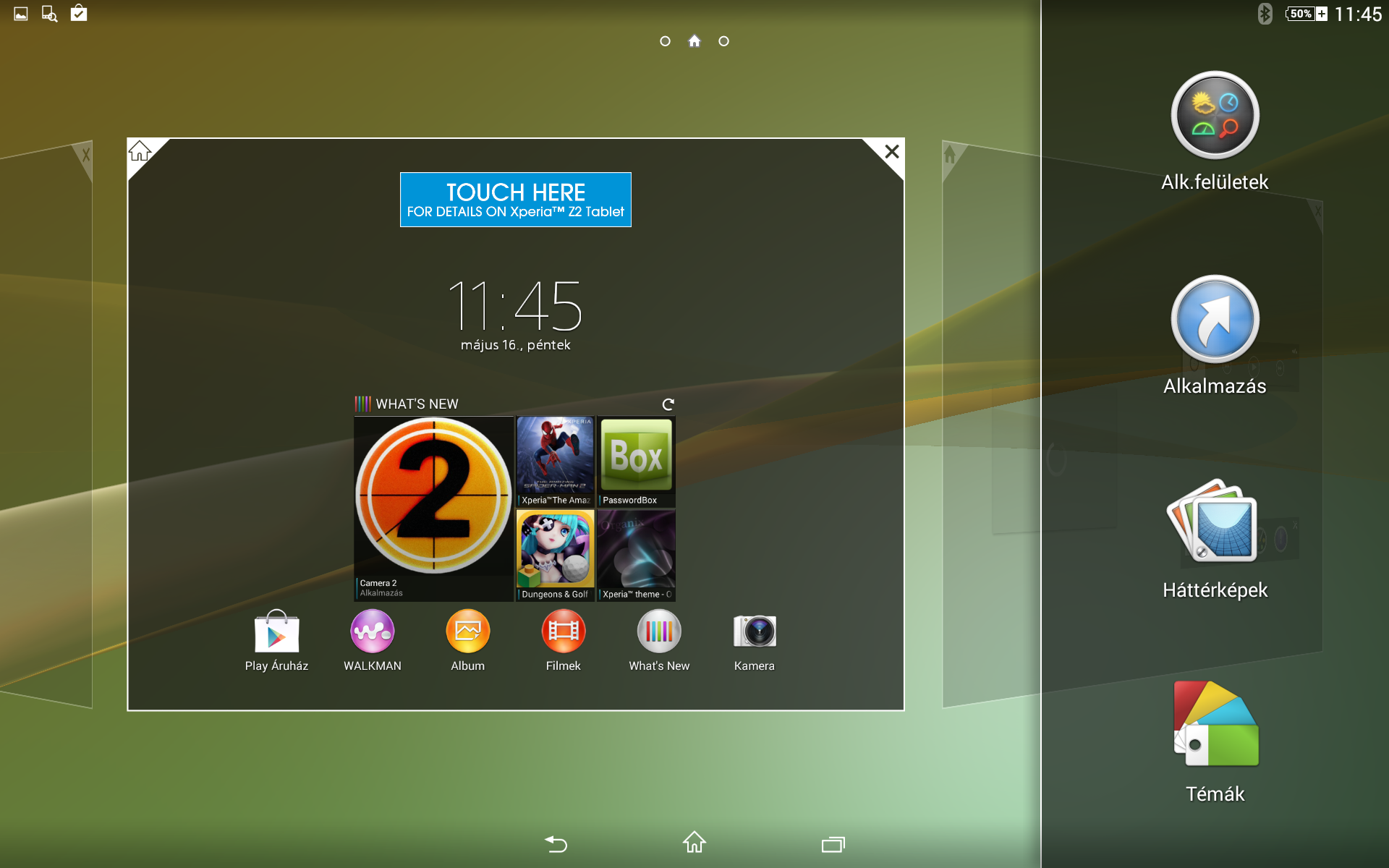 A kezdőképernyőn a legszembetűnőbb változás az, hogy az állapotsáv és a gombok sávja különvált, és mindkettő teljesen áttetsző lett, de a Sony lecserélt néhány ikont is. Nekünk nem minden változás jött be, az új akkumulátor ikon például nem tartalmaz vizuális megjelenítést, csak százalékos formában mutatja az aktuális töltöttségi szintet, így nem elég egyetlen pillantást vetni rá, hogy megtudjuk, hogyan állunk szuflával. Kezdőképernyőből összesen hetet használhatunk, és ezek mindegyikére 7×8-as elrendezésben 56 ikon pakolhatunk ki. Fix ikonsor nincsen, és eltűnt az Xperia Tablet Z-nél alkalmazott fix keresősáv is. Az alkalmazásválasztó a jobb felső sarokban érhető el, az értesítési tárhely és a kapcsolópanel pedig, a Google alapértelmezett megoldásához hasonlóan, a bal és a jobb oldalról húzhatók le.