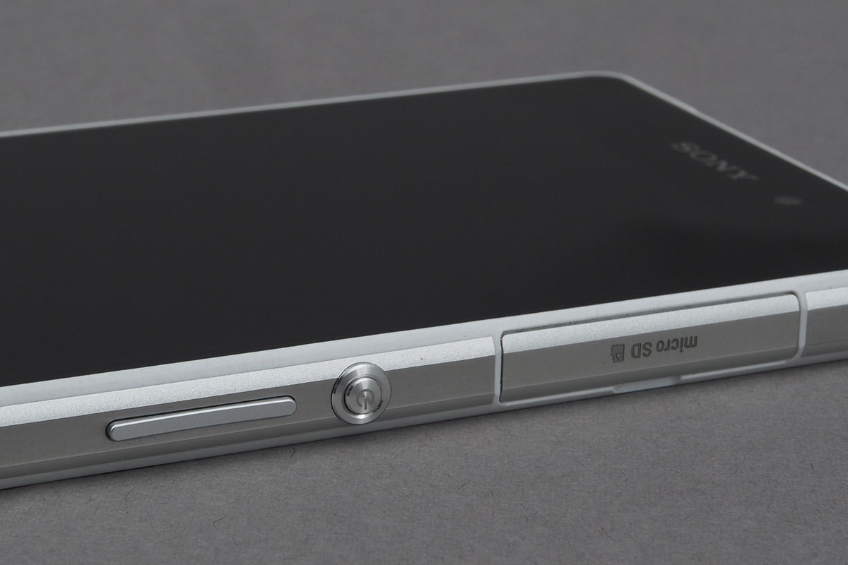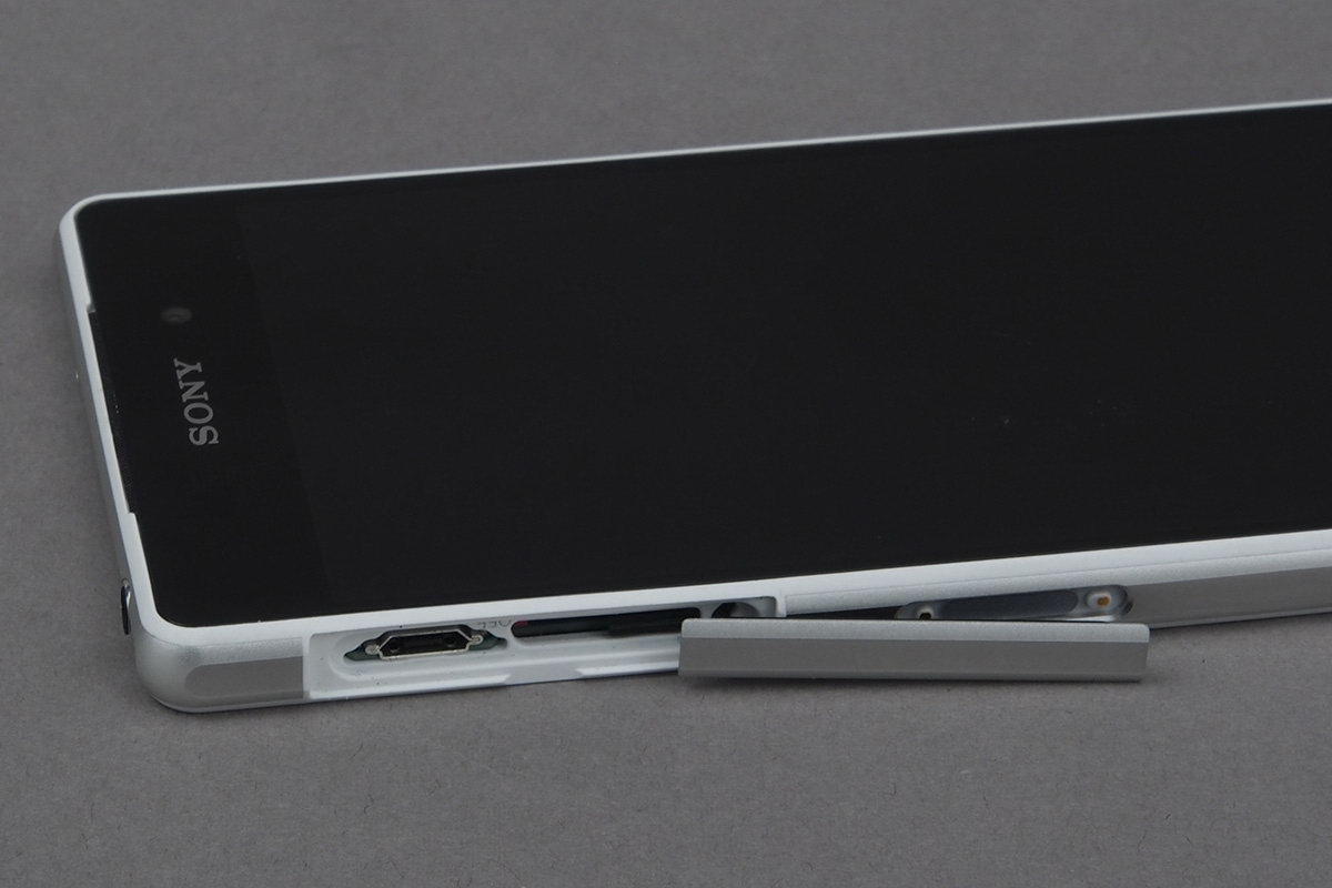 Ahogyan korábban már említettük, a víz- és porálló kialakítás zálogaként a Sony az oldalsó csatlakozókat ajtó mögé rejtette. A kiosztás első ránézésre jottányit sem változott a Z1-hez képest, valójában azonban ez nem így van: a microSD-kártya helye a bal oldalról átkerült jobbra, a SIM foglalata pedig jobbról balra. További változás, hogy utóbbi a bal oldalon lévő microUSB-vel közös ajtót kapott. A bal oldalon találjuk még a dokkoló „tüskéit”, jobb oldalt pedig a bekapcsoló gomb (mondanunk sem kell, kör alakú), a hangerőszabályzó és a fényképező gombjai sorakoznak. Mikrofon az alsó és a felső élre is került, a fülhallgató kimenete pedig a készülék felső részén foglal helyet. Látható, hogy a gombok helyén a Sony érdemben nem változtatott, így szerintünk a hangerőszabályzó továbbra is alacsonyan van, nem esik igazán kézre.