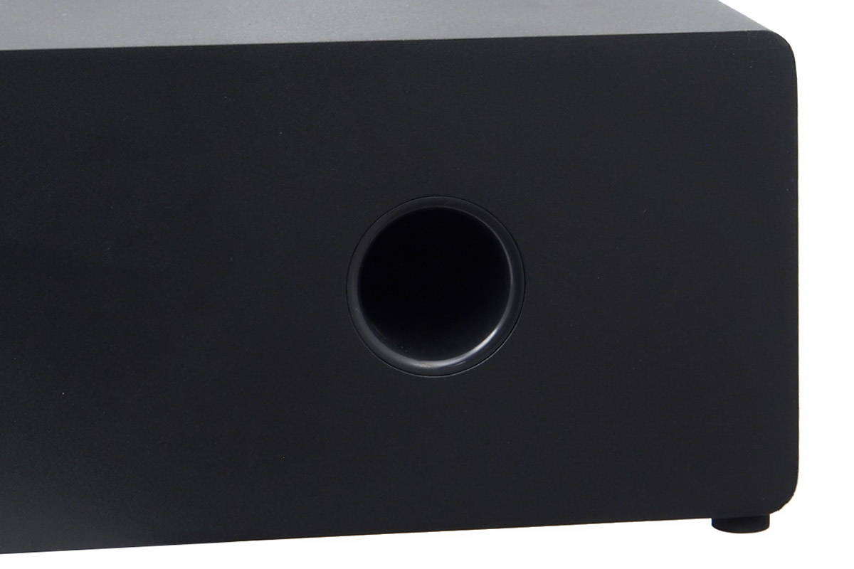 A hátsó részen igazából sok meglepő dologgal nem találkozhatunk: ide került a sztereo analóg (RCA) bemenet, az S/PDIF és optikai digitális bemenetek, a főkapcsolód és a tápcsatlakozó – illetve még egy fontos dolog, mégpedig a mélynyomó csatlakozója, amelyre értelemszerűen külső mélyládát csatlakoztathatunk.