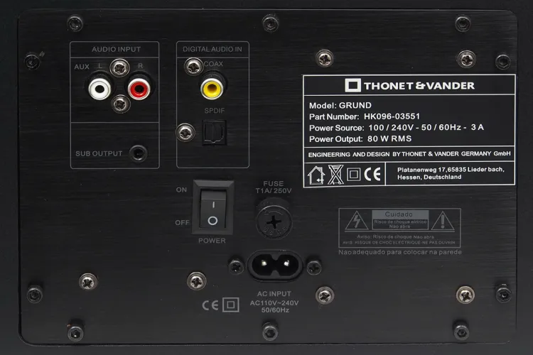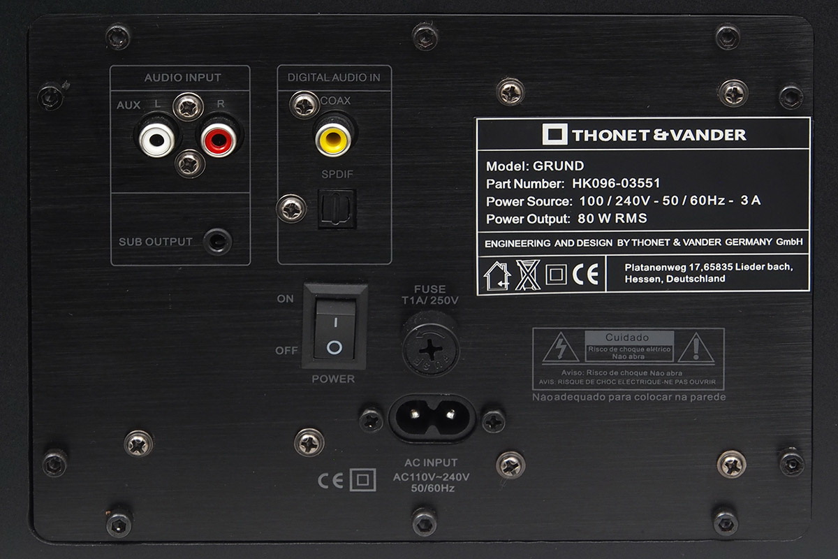 A Thonet & Vander Grund, ahogyan az a bevezetőből is kiderült, egy sztereo hangfal, kétszer két hangszóróval, amelyek egy közös készülékházban kaptak helyet. Külön mélynyomó nincsen a szetthez, azonban a fő hangsugárzók mérete elég nagy ahhoz, hogy önmagukban is tisztességes mély hangokat szólaltassanak meg – főleg, hogy a gyártó arra is figyelt, hogy a hangfal mérete ne legyen korlátozó tényező. A mély és közepes hangokat két 5 colos hangfal szólaltatja meg, míg a magasak megszólaltatásának feladata két 1 colos speakerre hárul. A mélyhangok kiemelését segíti, hogy mindkét nagyobb hangszóróhoz tartozik bass reflex nyílás.
