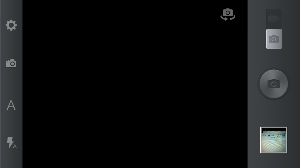 A fényképek elkészítése fájdalmasan lassú, a (szoftveres) gomb megnyomása után kb. 3 mp, amíg elkészül a felvétel – viszont vagy egy „Speedily” mód, amikor ez az intervallum lecsökken úgy 1 mp-re. A képminőségben nem vettünk észre különbséget. Ha az előlapi kamerát használjuk, akkor nem lehet állítani sem a felbontást sem az EV-t, ezeket leszámítva azonban minden más működik (és persze nincsen vaku sem).