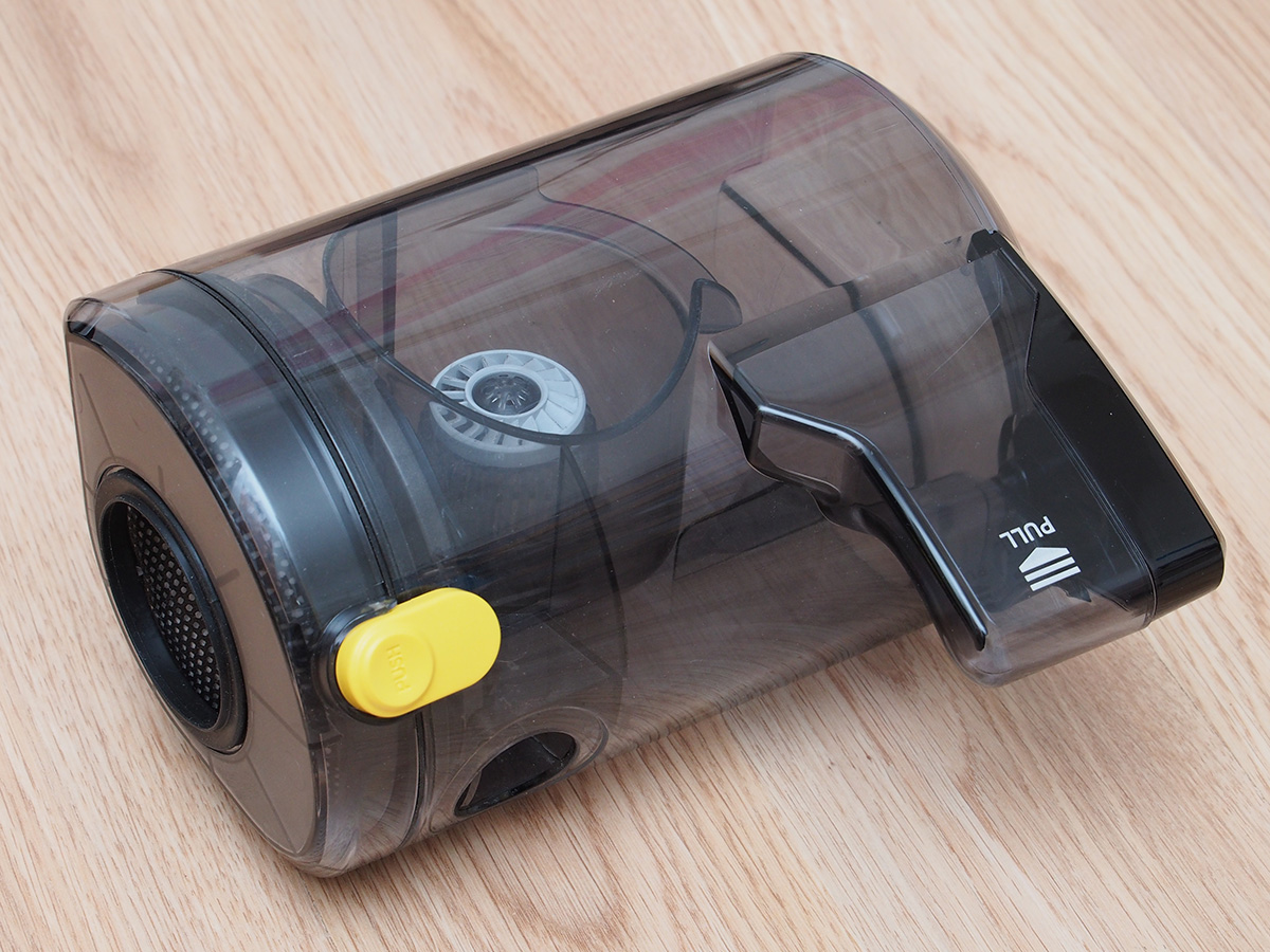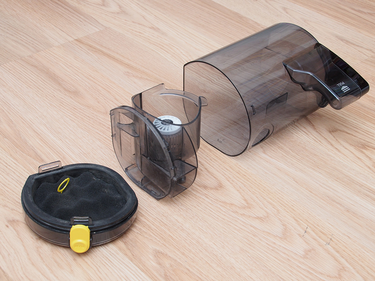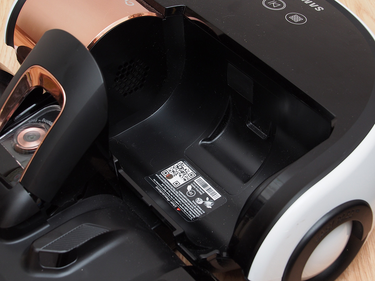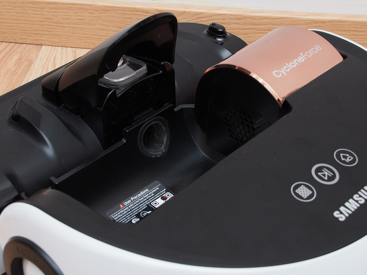 A tartályba a kamera alá rejtett csövön keresztül érkezik a koszos levegő, amit a jobb oldalon a szűrőn keresztül szív ki a vákuum motor. A tartályban azonban nem egyenes az út a bemenettől a kimenetig, hiszen a Samsung a Dyson által bevezetetthez hasonló módon még a szűrő előtt megpróbálja szétválasztani a koszt a levegőtől.