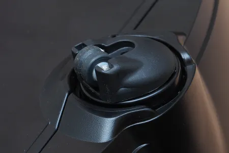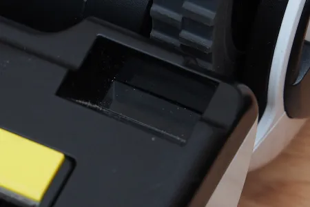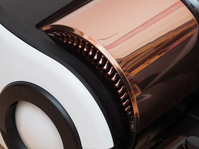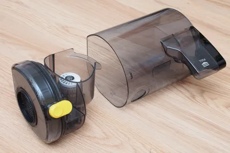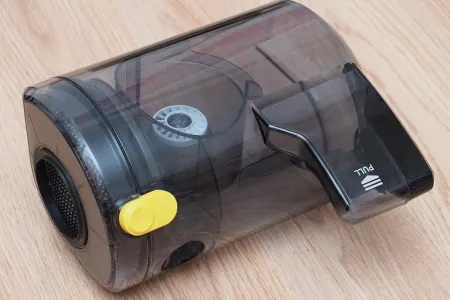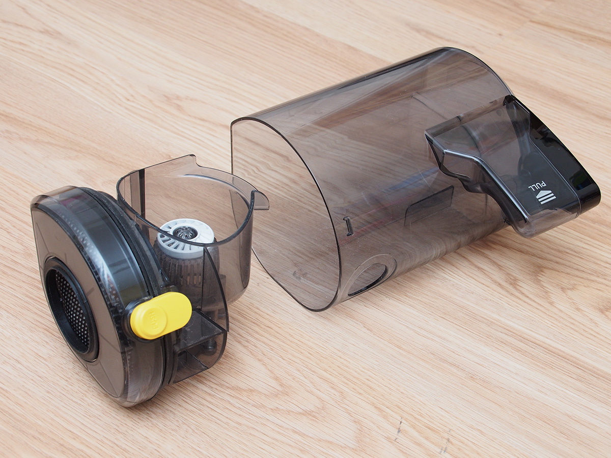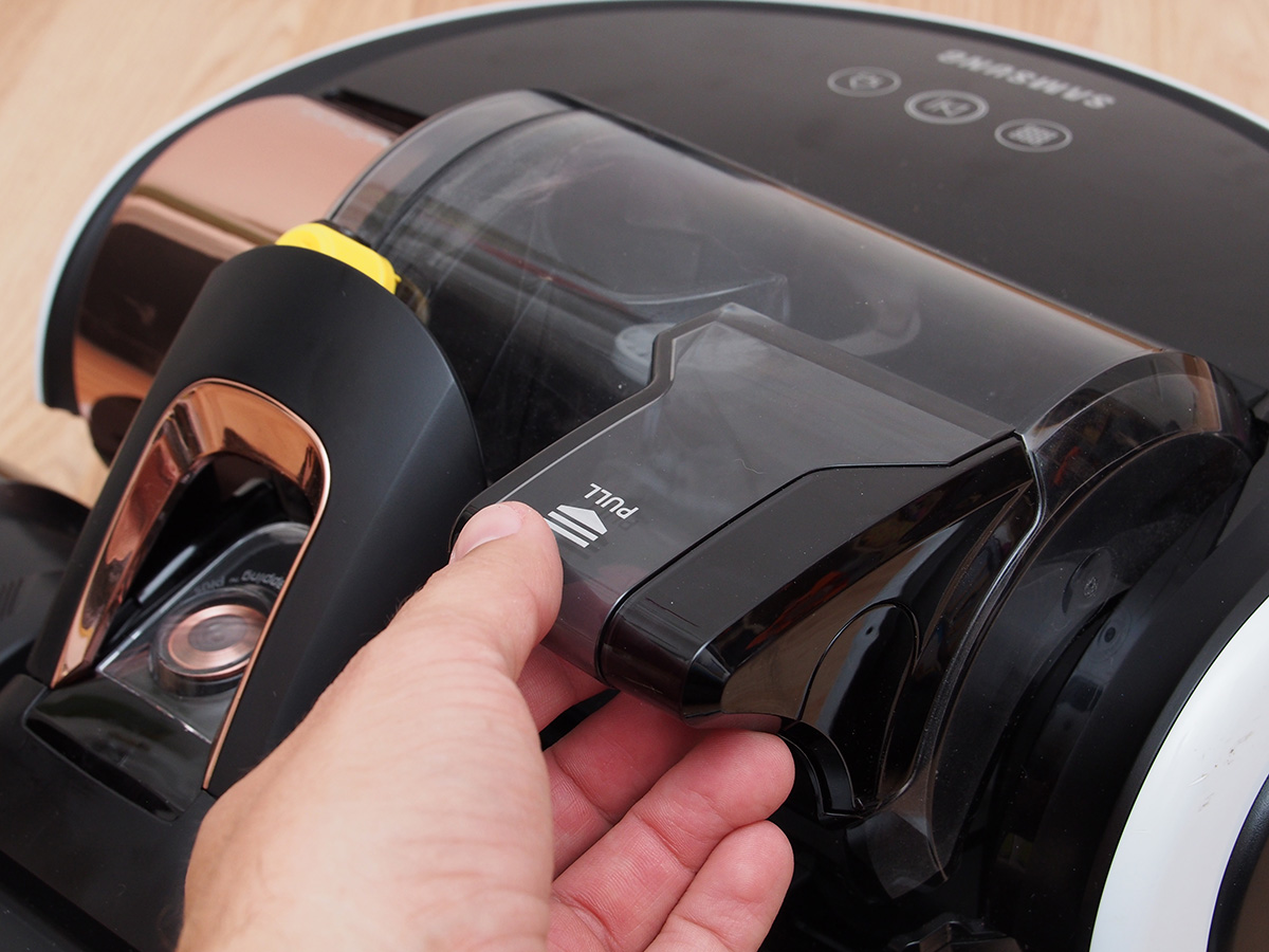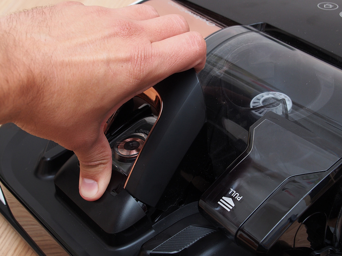 A tartályba a kamera alá rejtett csövön keresztül érkezik a koszos levegő, amit a jobb oldalon a szűrőn keresztül szív ki a vákuum motor. A tartályban azonban nem egyenes az út a bemenettől a kimenetig, hiszen a Samsung a Dyson által bevezetetthez hasonló módon még a szűrő előtt megpróbálja szétválasztani a koszt a levegőtől.