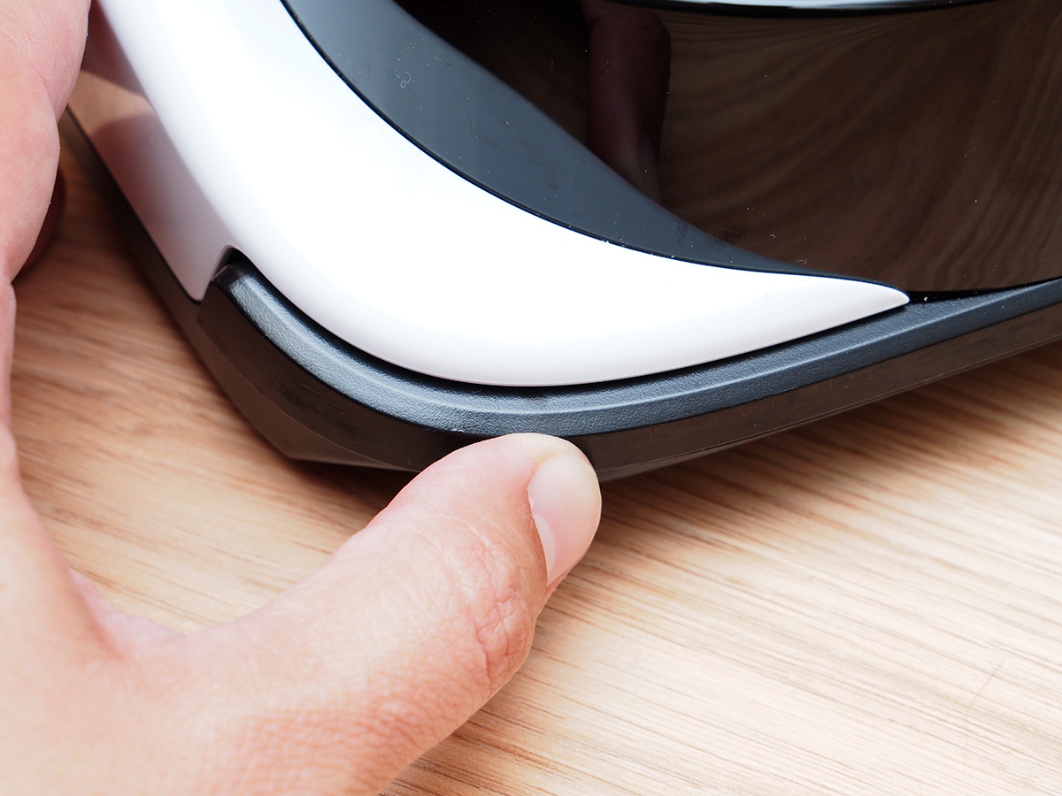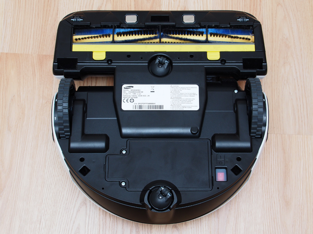 A PowerBot VR9000 alja nagyon egyszerű felépítésű, de azért bőven van miről beszélni. Először is meg kell állapítanunk, hogy a Samsung elhagyta az oldalkeféket. Ez azért is érdekes, mert a hasonló formájú Neato egyik gyengesége a hiányzó oldalkefe miatti gyenge fal menti takarítás volt. A Neato legújabb Botvac modelljeire éppen ezért már került oldalkefe, de az is tény, hogy a Samsung PowerBot legnagyobb riválisának kinevezhető Dyson 360 Eye-re se került ilyen eszköz.