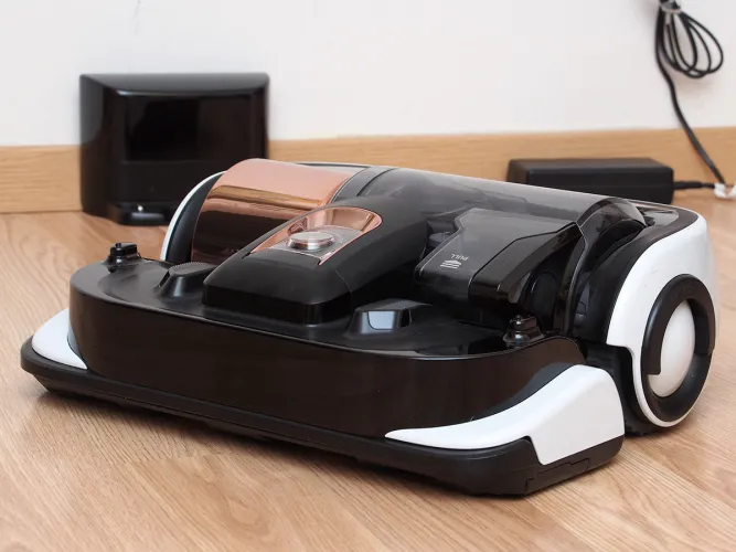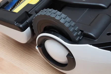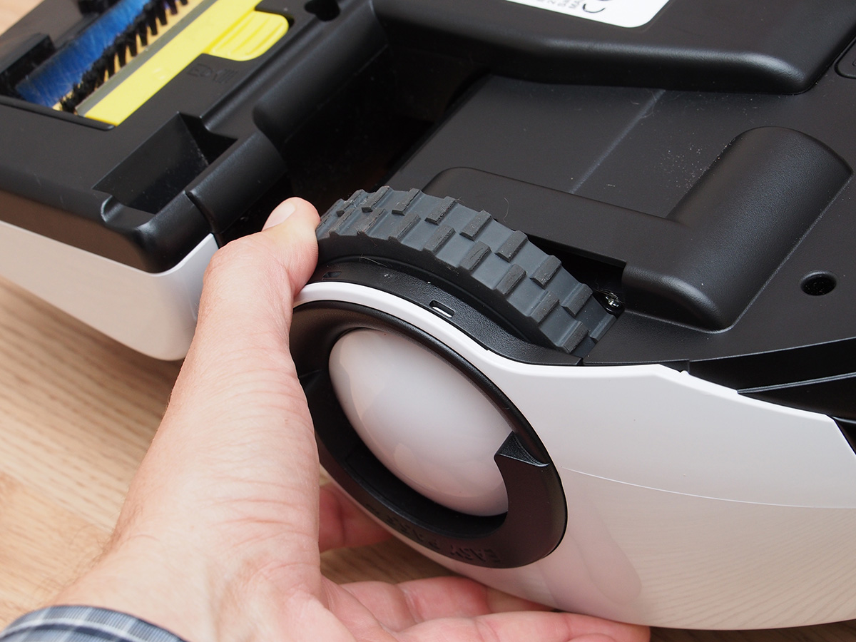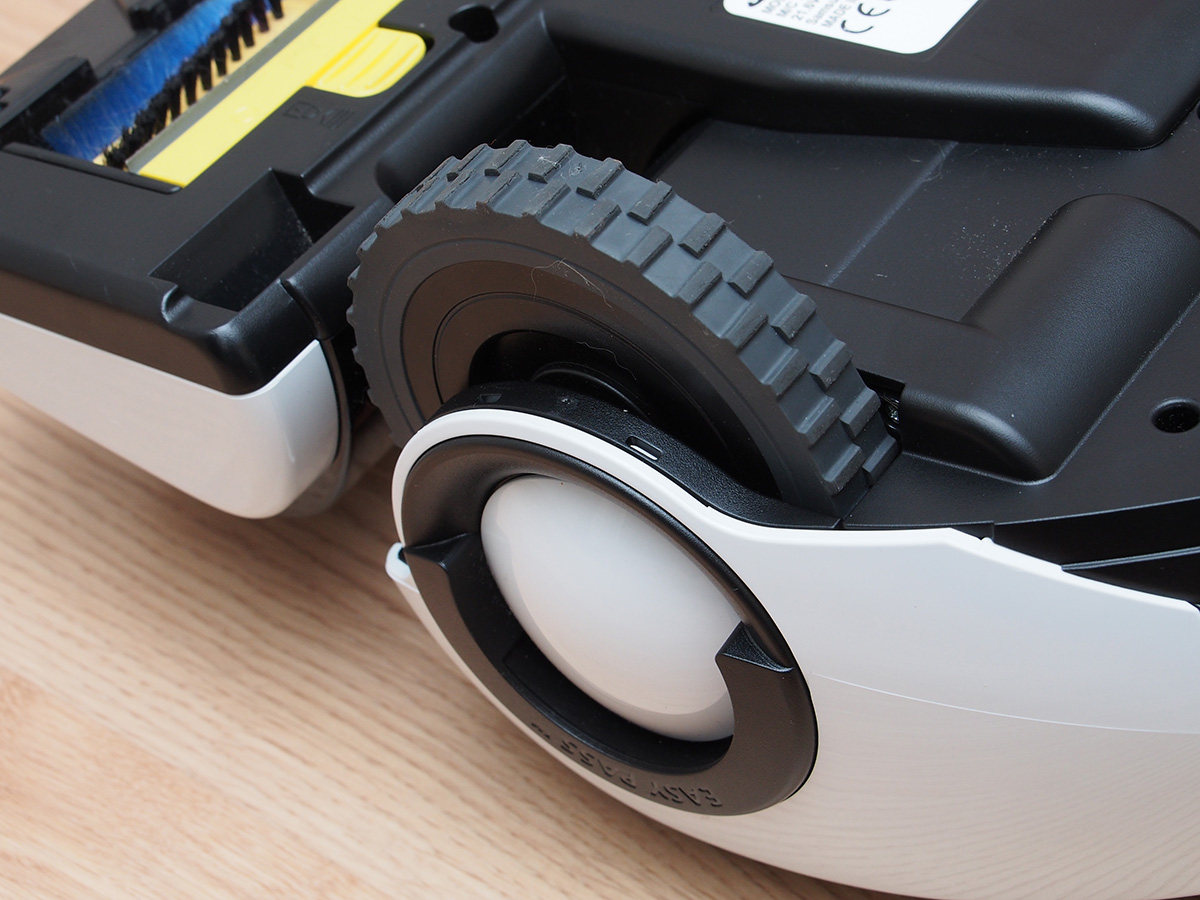 A brit konkurenshez hasonlóan a Samsung is fontosnak érezte, hogy megreformálja a robot meghajtásának módját. Hernyótalpak helyett Koreában a nagyobb méretű kerekekre szavaztak, amelyek véleményünk szerint önmagukban ugyanúgy nem biztosítanak jobb terepező képességet, mint a hernyótalpak. Persze biztosan van előnye is a nagyobb méretnek, ráadásul hely is volt rá bőven a portartály és a vákuummotor mellett.