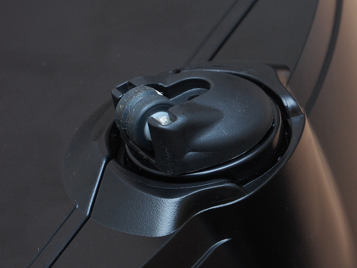 A megtisztított levegőt a bronz színű cső kerék felőli végénél lévő rácson keresztül fújja ki.