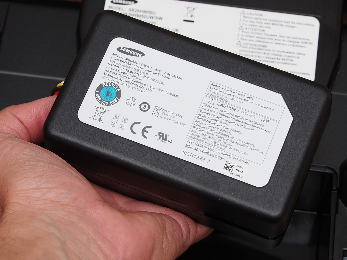 A PowerBot üzenete a nagyobb szívóerő, amihez azonban jóval több energia is kell, mint ami eddig a Navibotok rendelkezésére állt. A Samsungnál nagyon komolyan is vették ezt a területet, így egy 21,6 V-os, 3200 mAh-ás lítium ion akku került a burkolat alá. Ez bő másfélszer akkora teljesítményű, mint amit a Neato a legújabb Botvac modellekbe épít, és szinte biztos, hogy nagyobb a Dyson akkujánál is.