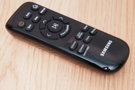 Ahogy említettük, a tartozékok listája darabszámot tekintve szerény, de tulajdonképpen rendben van. A távirányító például egy teljesen új darab, ráadásul nagyon jól is néz ki. A Samsung robotjainál szinte mindent ezzel a távirányítóval érdemes intézni, nagyon sok mindent máshogy nem is lehet beállítani. A távirányító érdekessége nem is ez, hanem az elején lévő két nagy lencse, amelyeken keresztül egy célpontot (tenyérnyi kör, középen egy ponttal) lehet vele a padlóra vetíteni. Ha ez a célpontot a robot körül van valahol, akkor az orrával odafordul és követi azt. Így lehet a robotot a legegyszerűbben egy koszos felületre irányítani, ott pedig a koszt felszedetni vele. Zseniálisan kitalált rendszer és tényleg hasznos is. Sokkal kényelmesebb így irányítani a robotot, mint a jobbra-balra nyilakkal.