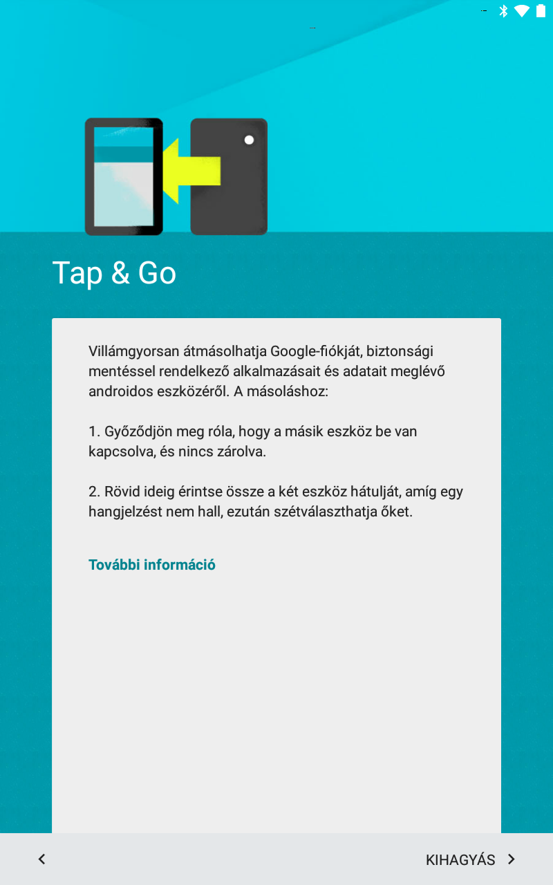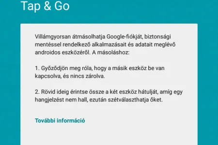 Egyszerűbb lett a régebbi készülékekről való átköltözés a Tap & Go segítségével, azonban a funkció még nem olyan kényelmes, mint az Apple esetében, minden adatot, alkalmazást, beállítást nem tud átvinni egyik készülékről a másikra. Az alkalmazások egyébként a Google Playből töltődnek le, és a belépési adatok elvesznek a folyamat során.