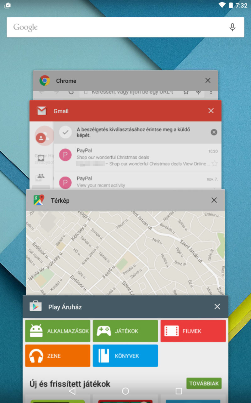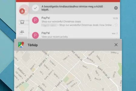 Az alkalmazásválasztó szintén új dizájnt kapott (és fentebb már írtuk, hogy más lett a neve, mostantól Overview névre hallgat). Egyszerre több app látszik benne, viszont részben egymás mögött, ami a kezelést nem könnyíti meg. Ha be szeretnénk zárni valamit, akkor azt továbbra is a görgetésre merőleges mozdulattal tehetjük meg (ki kell tolni az appot a listából). Sajnos az összes program bezárására továbbra sincsen mód. Az viszont nagyon jó, hogy egy-egy app most már több „kártyát” is kaphat. A böngészőben például minden fül külön is elérhető, ennél azonban praktikusabb, hogy a levelezőt is használhatjuk ezentúl úgy, hogy a feladatkezelőből váltogatunk egy éppen írott és egy korábban kapott levél között.