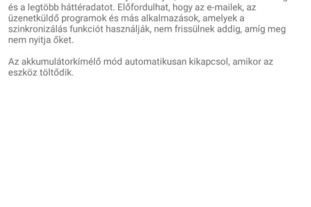 Az energiatakarékos funkciók beépítése eddig szintén a gyártókra volt bízva, most már ez is része az Android 5.0-nak: 15%-os töltöttségi szint alatt vagy manuálisan is aktiválható, és a szokásos trükkökkel operál (adatkapcsolat letiltása, fényerő csökkentése, rezgés kikapcsolása, stb.). Egyáltalán nem paraméterezhető megoldásról van szó, aminél a gyártók valószínűleg ezután is tudnak majd jobbat beépíteni; de már ez is jobb, mint a semmi.