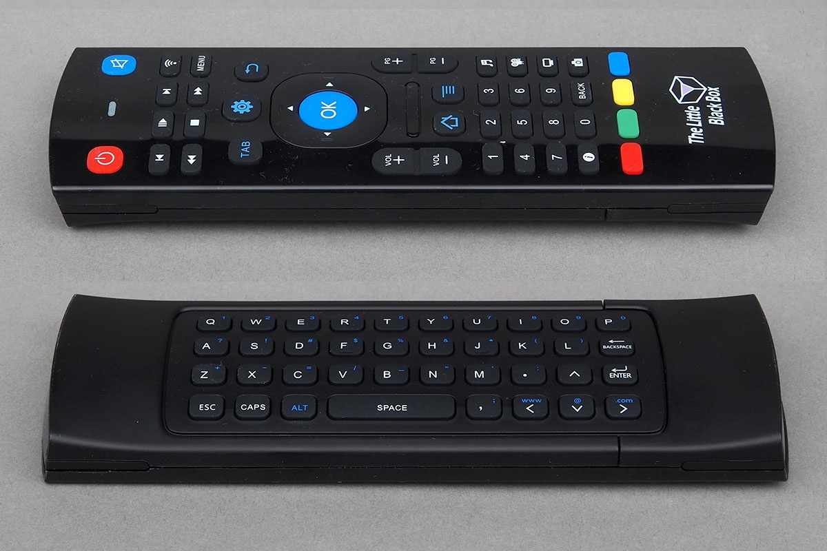 A The Little Black Box v2 mellé jár egy teljesen hétköznapi távvezérlő, amelynek képességeiről most nem is fog sok szó esni; a legnagyobb érdekessége az, hogy a fő tartalomtípusokhoz közvetlen elérést biztosít. Az itthon forgalmazott példányokhoz alapból nem jár ugyan, de december 31-ig ajándék (és egyébként sem túl drága) a második, rádiós távirányító; ez az egyik oldalán tartalmazza mindazokat a gombokat, amelyek a sztenderd változaton megtalálhatók, a másik oldalára viszont egy teljes értékű qwerty billentyűzet is került. YouTube-hoz, Facebookhoz és úgy általában a szöveges műveletekhez nagyságrendekkel jobb, de talán ezt nem is kell különösebben ecsetelni.