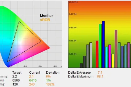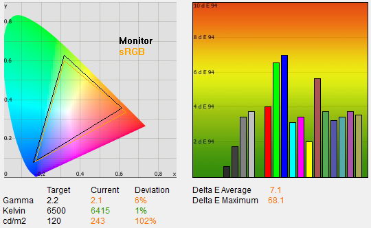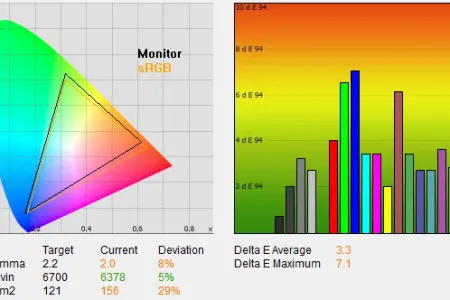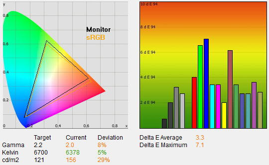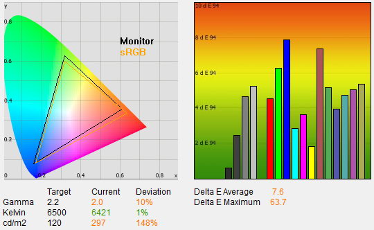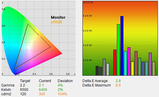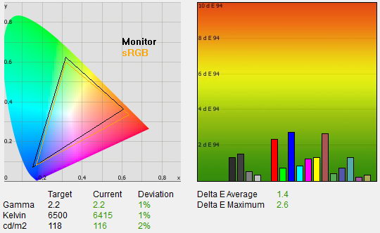 Az üdvözítő eredményhez ez persze még kevés, ahhoz, hogy a színhelyesség a profik igényeit is kielégítse, műszeres kalibrációra is szükség van. Ennek eredménye szokás szerint több mint kielégítő, 1,4-es átlagos deltaE-t és 2,6-os maximális eltérést mértünk, ami azt jelenti, hogy a megjelenített és az elvárt színek, a szem számára, azonosak. 2,2-es gammát, 6400 K-s színhőmérsékletet, 116 cd/²-es fényerőt, 0,13 cd/m²-es feketét és 878:1-es kontrasztot mértünk. A fogyasztás fenti beállításokkal 29 watt volt, kikapcsolva pedig 0,4 wattos értéket mértünk.