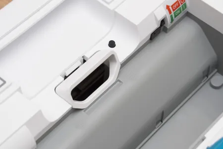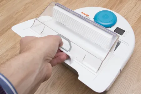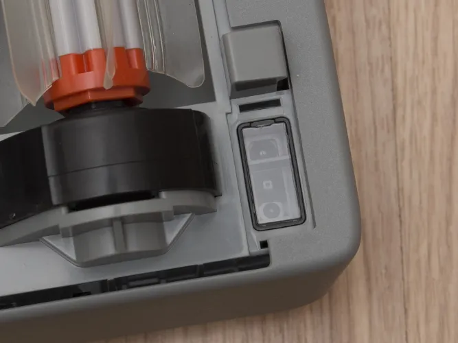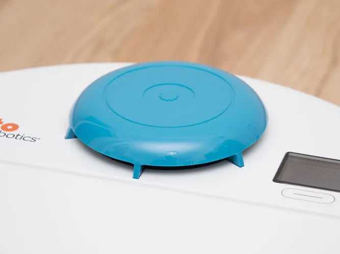 A tartályon belül található még egy ON/OFF kapcsoló, ami a robot főkapcsolója, és aminek a bekapcsolására a frissen kicsomagolt roboton külön matrica is figyelmeztet. A kapcsoló melletti kupak a robot frissítéséhez használható micro USB csatlakozót rejti. A Neato az egyetlen olyan porszívó (vagy talán egyetlen robot) gyártó, amely rendszeresen ad ki frissítéseket a robotjaihoz. A közel 5 éve bemutatott XV szériához még szeptemberben is készült frissítés, ami az akkumulátorkezelést hivatott javítani (jelenleg is teszteljük).