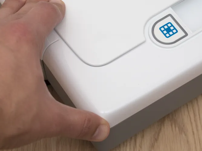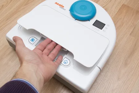 Érdekes módon szakítottak az egyértelmű kezeléssel. Az előd modellen a START feliratú gomb egyértelműen jelezte, hogy mivel kell a robotot munkára fogni, de a Botvac robotokra ilyen már nem került. Helyette az ütköző mögött kialakított kapaszkodó (aminél fogva a robot felemelhető) két oldalára tettek egy-egy gombot, amelyeket szöveg helyett piktogramok díszítenek. Szemből nézve a jobb oldali házat szimbolizáló ikon nem a házba vagy dokkolóba való visszatérést, hanem a ház takarítást akarja jelenteni, mígy a közepén kiszínezett négyzethálós füzet a szpot takarítási módot aktiválja. Zavaros? Szerintünk nagyon. A ház gombot egyébként viágító csík szegélyezi, így sötétben is jól látható, és egyben ennek villogása adja az akkumulátor töltésének visszajelző fényét is.