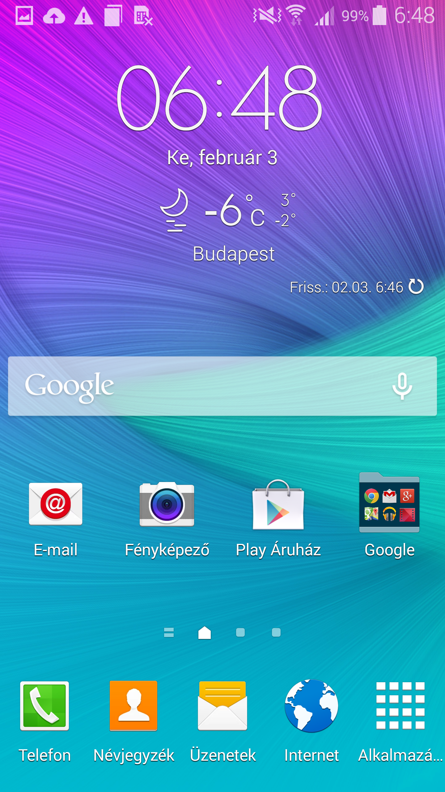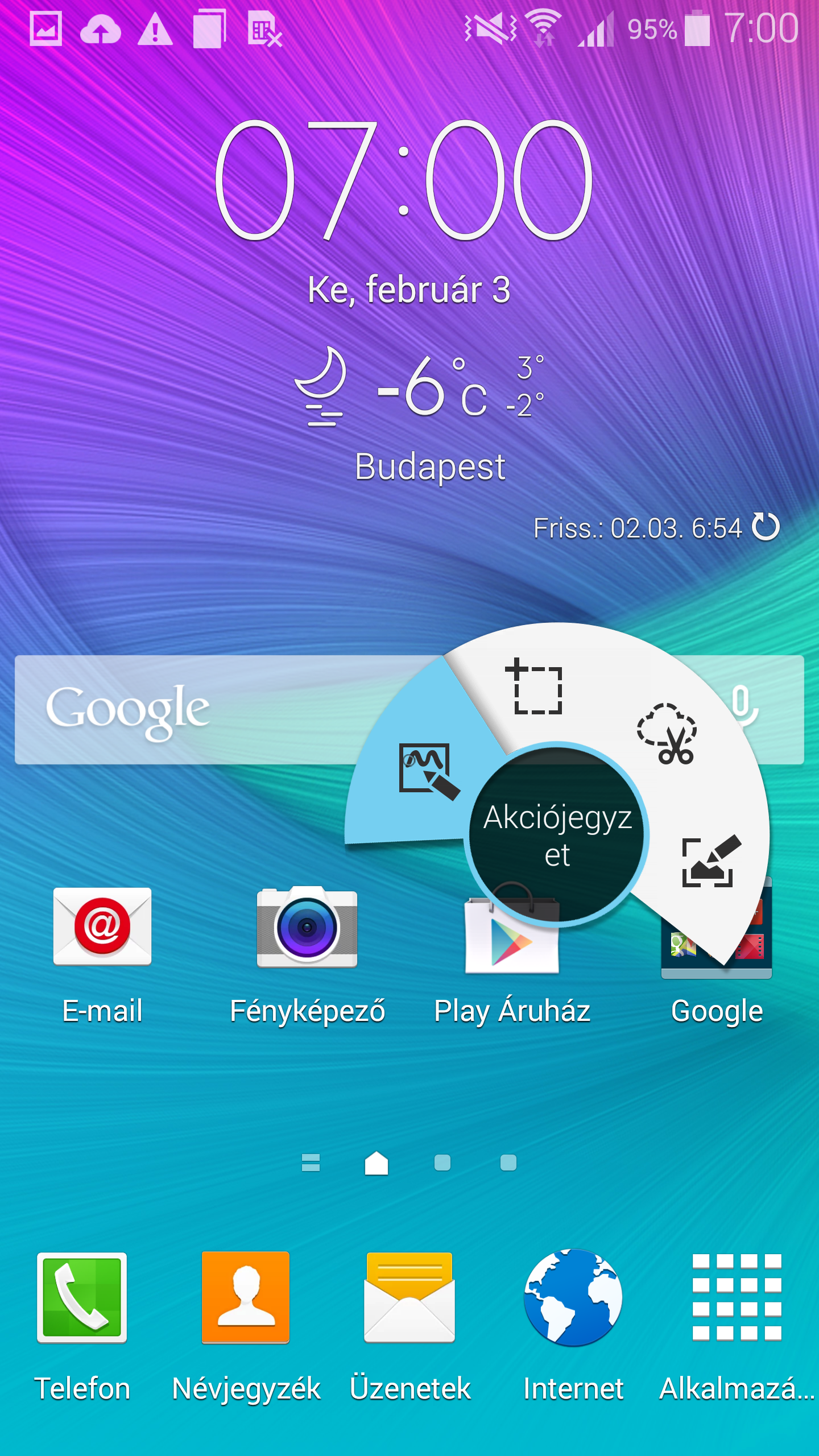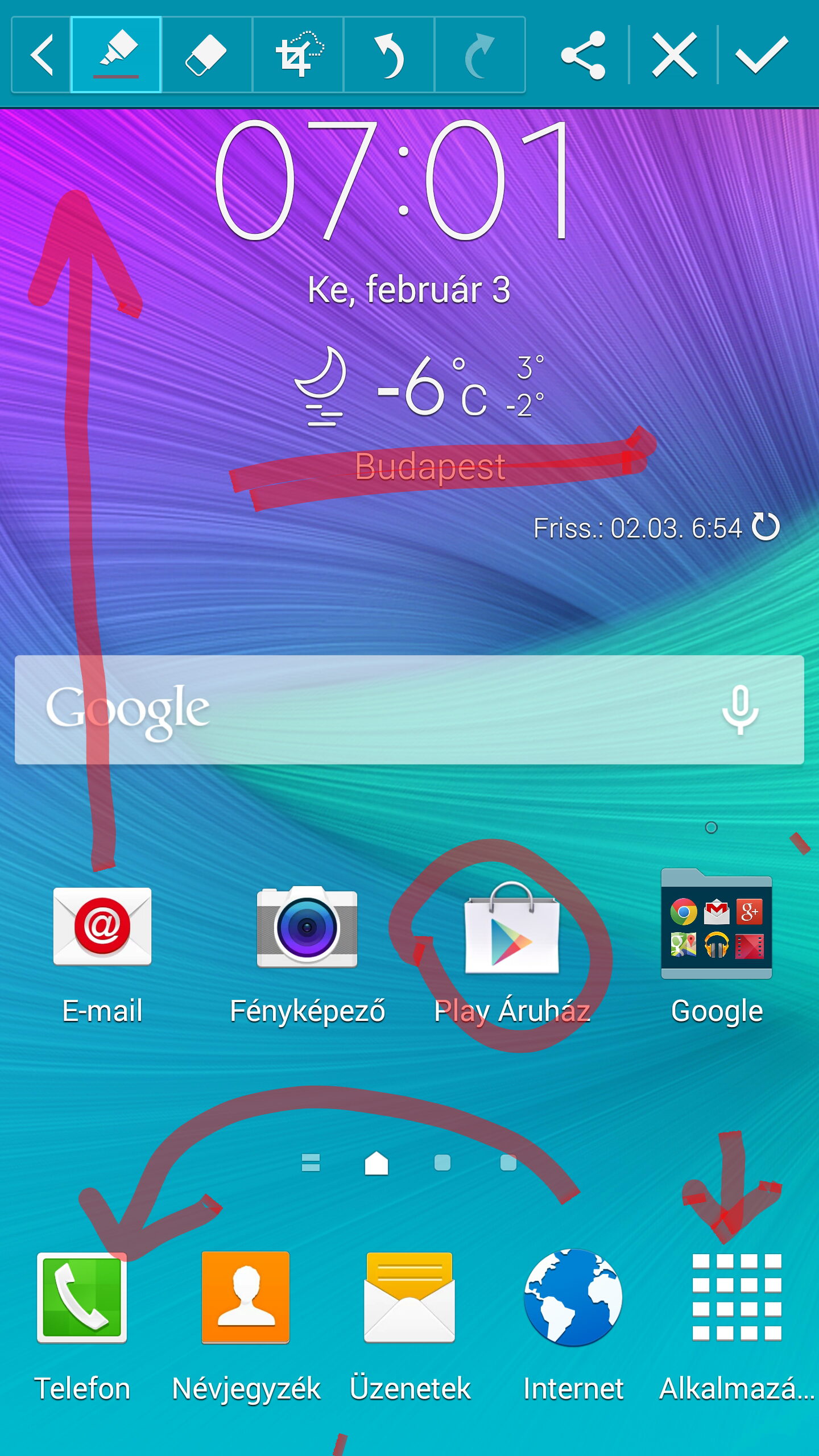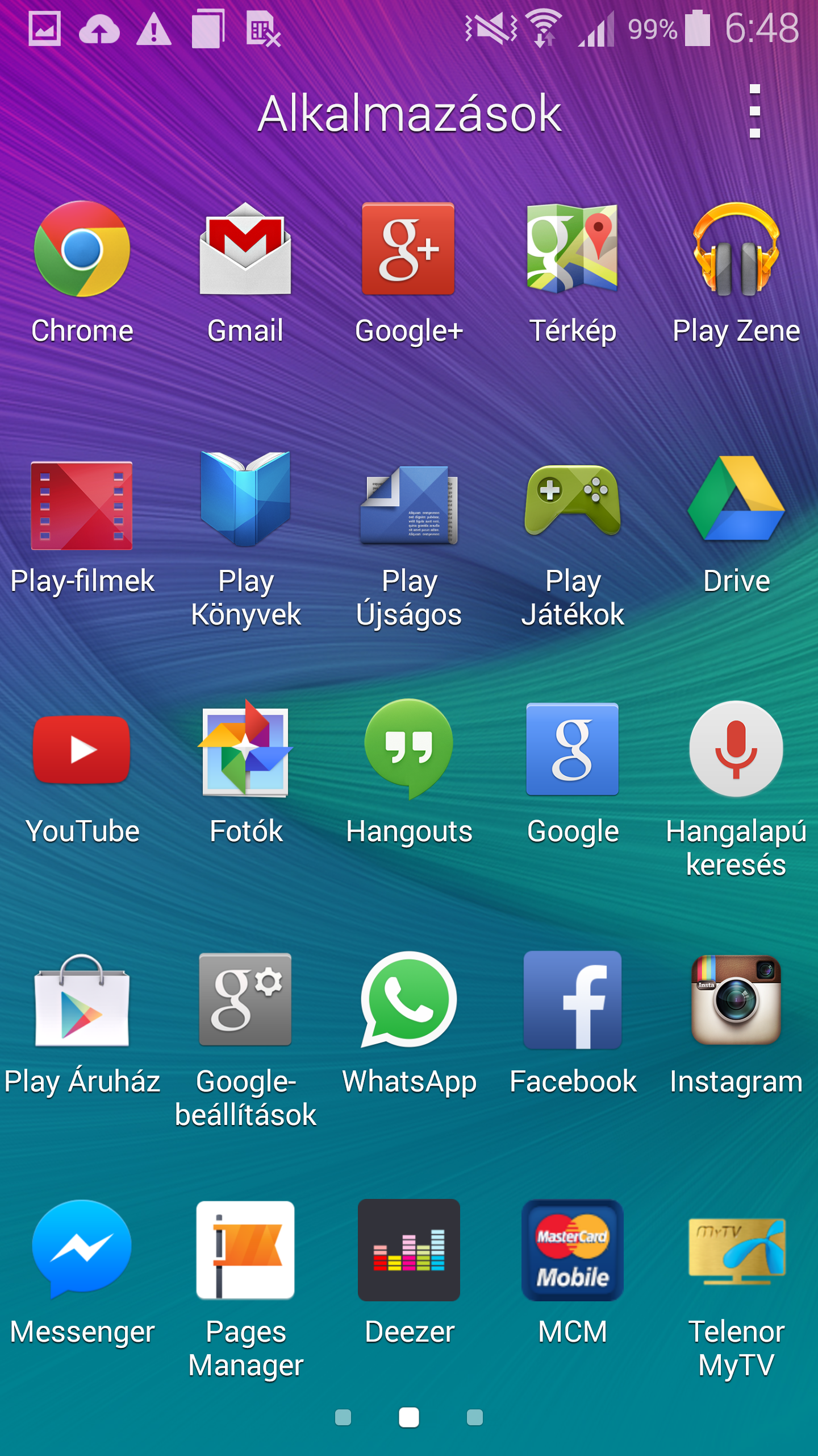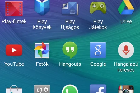Az S Voice a Samsung személyi asszisztense, amely magyarul sajnos még mindig nem tud. Az infra portot a Smart Remote-tal tudjuk kihasználni: a Note 4-et meglévő eszközeink távirányítására is használhatjuk. A PEN.UP-ról már írtunk, a Flipboard, a Dropbox, az Evernote, a Facebook, a Messneger, a WhatsApp és az Instagram pedig régi ismerősök, mindenki tudja, hogy mire valók. A programválasztó második oldalára a Google szoftverek kerültek (Chrome, Gmail, Google+, Térkép, Play Zene, Play-filmek, Play Könyvek, Play Újságos, Play Játékok, Drive, YouTube, Fotók, Hangouts, Hangalapú keresés), ezekhez szintén nem szükséges bővebb magyarázatot fűzni.