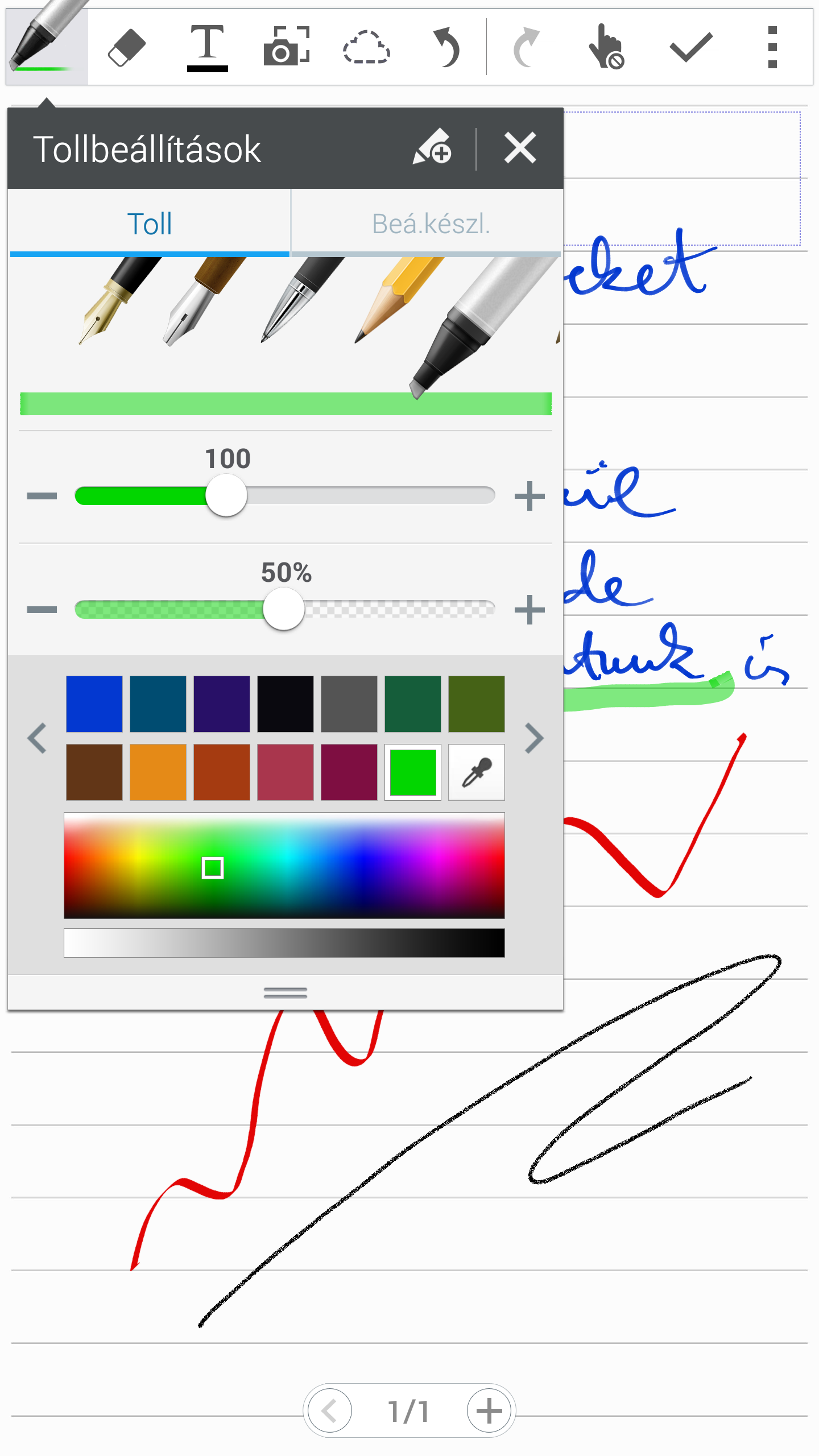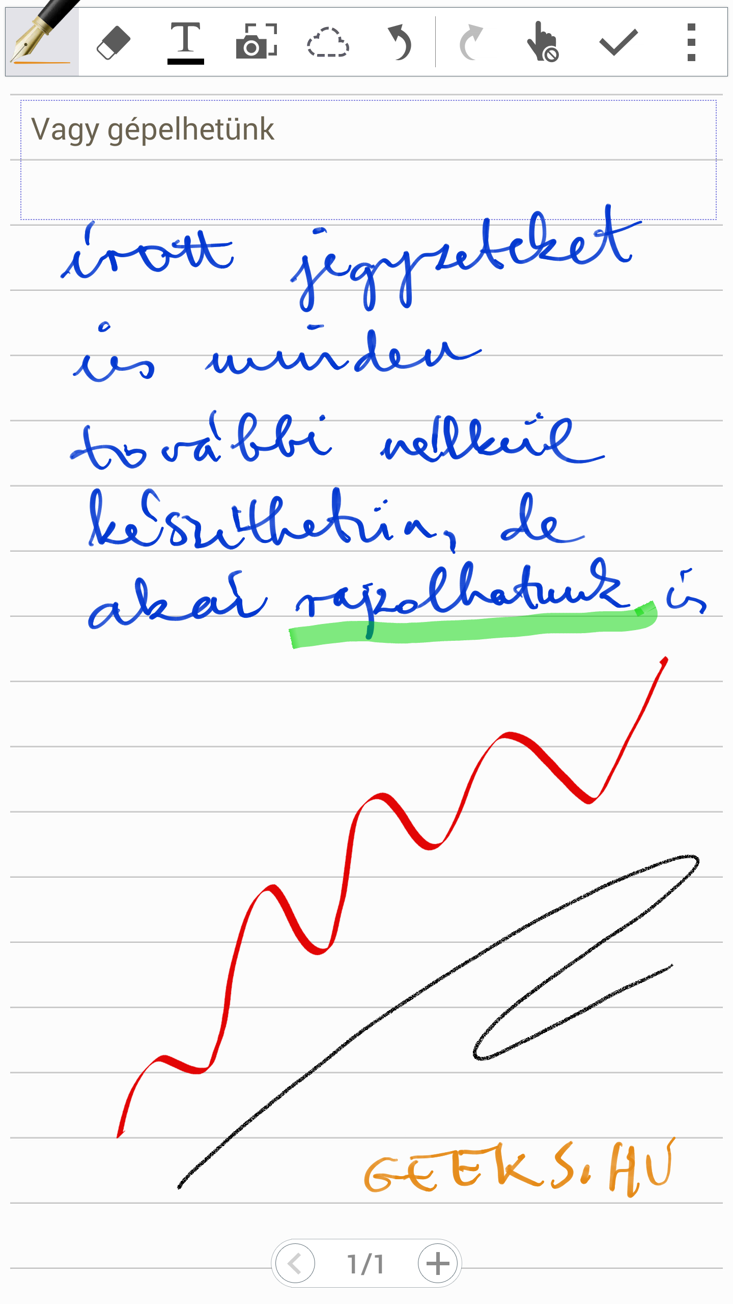 A jegyzeteléshez többféle alkalmazás is rendelkezésre áll (S Note, Scrapbook), és mindben számos előre definiált séma várja, hogy használjuk őket. Jegyzetelésnél a készülék a kézírást is felismeri. A toll nemcsak a nyomásérzékeny funkciója miatt használható jól, hanem azért is, mert a Galaxy Note 4 szoftvere többféle íróeszközt tud szimulálni, az egyszerű ceruzával és tollal kezdve a kiemelő filcen át a tust vagy akár ecseteket is. És persze a szín is szabadon választható, és kapunk egy sor szerkesztési segédletet is, mondjuk egyenes vonalak létrehozásához.