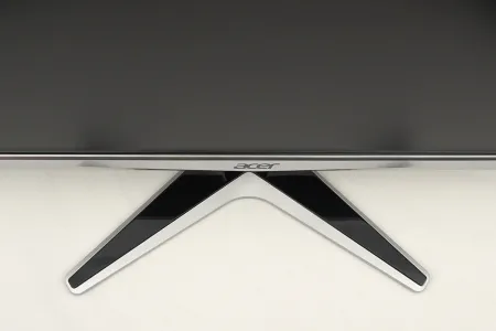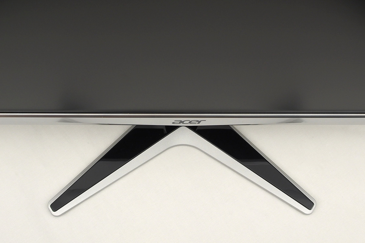 Járt már nálunk több olyan tévé (és monitor), amely hasonló koncepcióban készült, így természetesnek vettük, hogy az alsó részen viszont megmaradt a külső, látható káva is. Valószínűleg az Acer mérnökei el tudták volna tűntetni ezt a felületet is, ha szerették volna, de esztétikusabbnak tűnik így a monitor – arról nem is beszélve, hogy a márkajelzésnek máskülönben legfeljebb csak a talpon lett volna hely. Az alsó sáv ezüstös fényezésű, de nem fémből készült, hanem műanyagból. A G277HU talpa X alakú – szerintünk ezt a formát teljesen száműzni kellene a kütyük világából (legalábbis nem láttunk még olyan eszközt, amelyhez ment volna), mert semmilyen formával (kávával) nem hozható igazán összhangba.