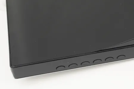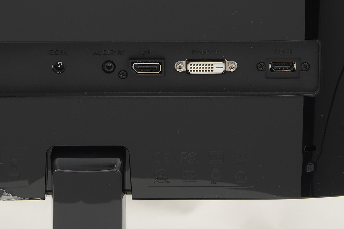 Ezt az Acer bepótolja a hátlapon, amely majdhogynem tükörként viselkedik – otthoni környezetben viszont jellemzően csak a fal lesz a monitor mögött, így ez túl sokat nem számít. A csatlakozókínálat látszólag csak digitális bemenetekre korlátozódik: DisplayPort, DVI és HDMI bemeneteket találunk hátul. És ez valóban így is van, mivel a DVI csatoló D-s, vagyis átalakítóval sem tudja fogadni az analóg jelet. (Illetve van még egy hangbemenet is, a beépített hangszórók számára.)