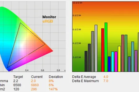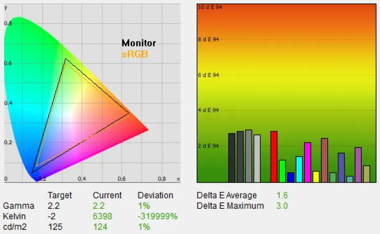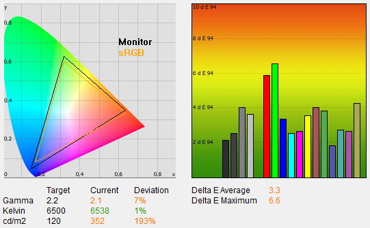 A monitor az Acertől megszokott négy színprofillal plusz a saját beállítások tárolásához egy ötödik opcióval rendelkezik. Az alapbeállítások relatív jók, az átlagos deltaE minden színprofil esetén közelít a 3-as értékhez, amelynek elérése már azt jelentené, hogy az elvárt és a megjelenített színek között csekély, szabad szemmel szinte nem is látható különbség mutatkozik csupán. A gamma ugyanakkor minden esetben alacsonyabb volt az optimális 2,2-es értékhez képes, amelynek az volt az oka, hogy a dinamikus kontraszt alapesetben aktív (és a méréseket mi rendszerint fekete háttérrel végezzük, csak a program ablaka foglalja a kijelzőt, ami lefelé torzítja a gammát). A dinamikus kontraszt kikapcsolása a színhelyességet jelentősen nem befolyásolja, viszont a gammát teljesen a helyére teszi – a fényerő ugyanakkor továbbra is sokkal magasabb az optimálisnál mind a négy gyári profil esetében.