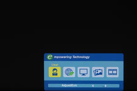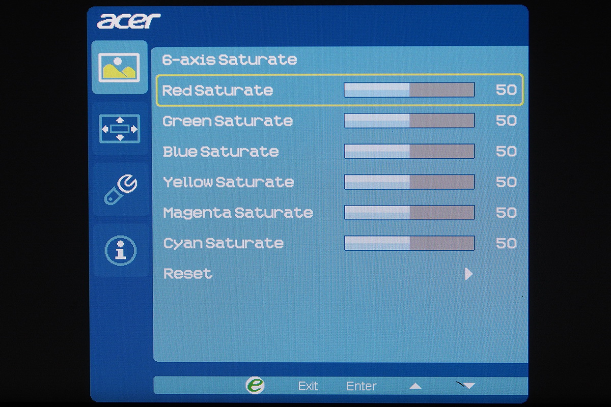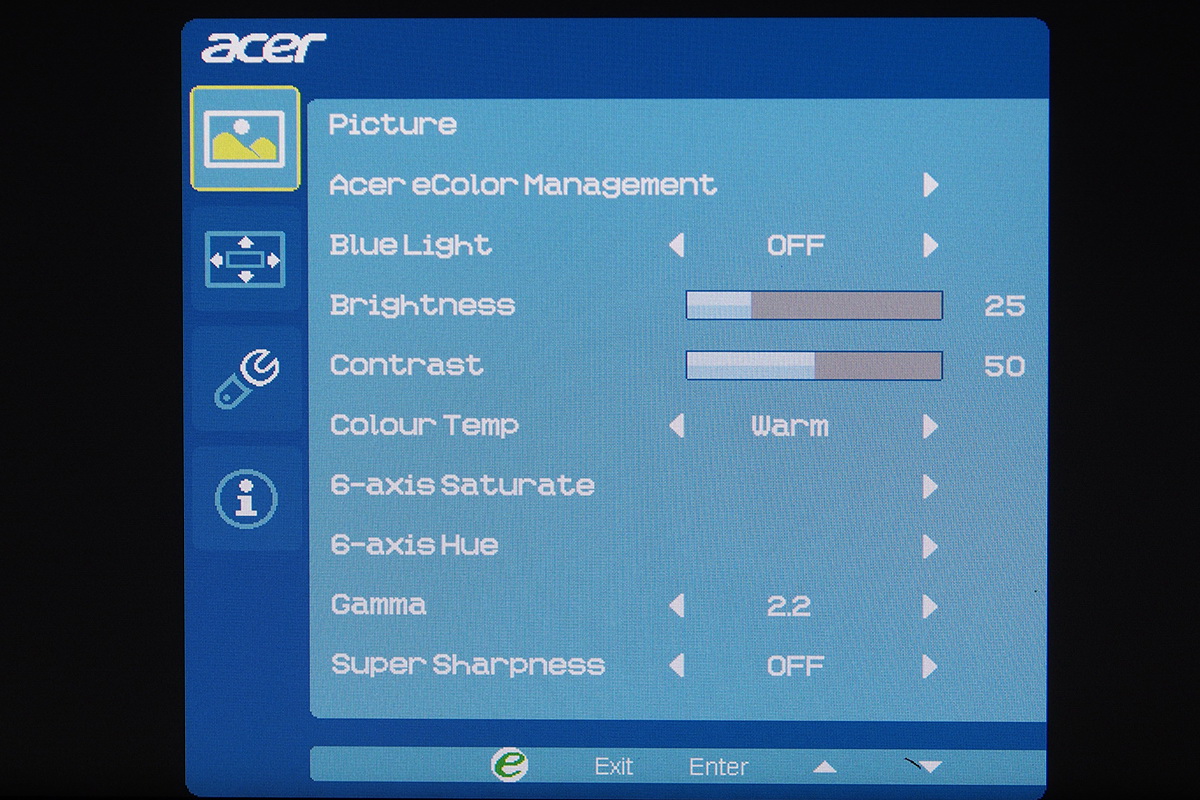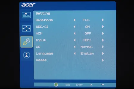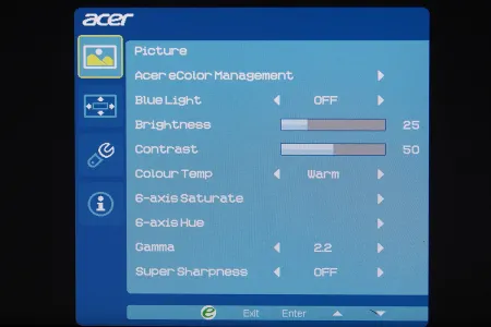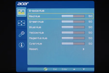 A monitor az Acer szokásosnak mondható menüjét tartalmazza, ami az átláthatóság és a kezelhetőség szempontjából egyáltalán nem gond, azt viszont továbbra sem értjük, hogy miért nem lehet a gyári színprofilokon módosítani – ha ezeken bármit állítunk, akkor a rendszer átrak az egyéni beállításokhoz. Ez főleg azért gond, mert a korábbi értékeket egyúttal felül is írjuk ezzel a lépéssel. A menü alapbeállítás szerint közvetlen a gombok felett jelenik meg, így az éppen elérhető opciókat is tudja mutatni. A korábban nálunk járt Acer monitorokkal ellentétben a G277HU viszonylag sok beállítási lehetőséget tartalmaz, a színkomponenseket például két ponton és RGBCMY tengelyek mentén tudjuk finomhangolni.
