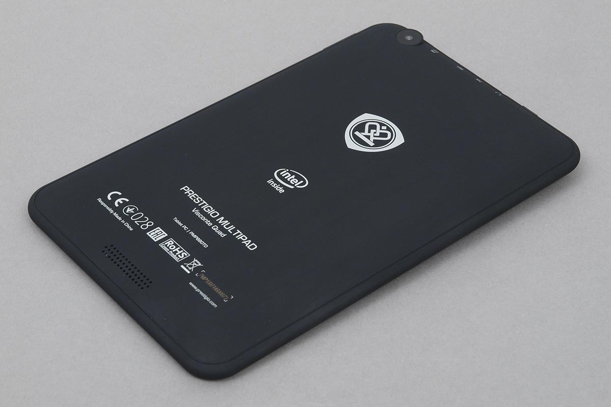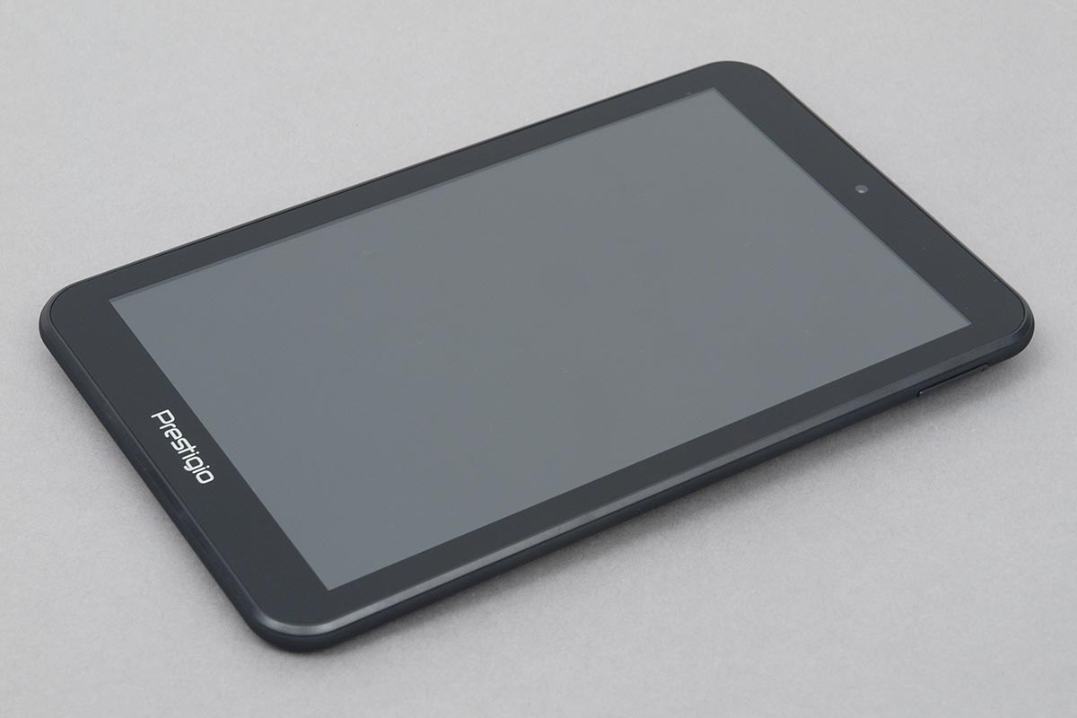 Természetesen, mivel egy táblagépről van szó, az alapvető formát adottak voltak, és ettől a Prestigio mérnökei láthatóan nem is nagyon akartak elszakadni. A sarkok viszont lekerekítettek, és a készüléknek a szó szoros értelmében nincsenek oldalai sem, ezek helyett a hátlap kialakítása olyan, hogy minden irányból szépen ráhajlik az előlapra. Az előlap valamilyen strapabíró üveglap (de nem Gorilla Glass), a hátsó rész pedig műanyagból készült, de a sima, egyszerű felület helyett kellemes tapintású gumiborítás került rá. A tablet ettől az apróságtól sokkal kényelmesebben használható, hiszen stabilan megmarad a kezünkben, viszont a felület könnyen koszolódik, ráadásul bármivel is érintkezik, az valószínűleg olyan nyomot hagy rajta, hogy azt csak nehézkesen lehet eltávolítani.