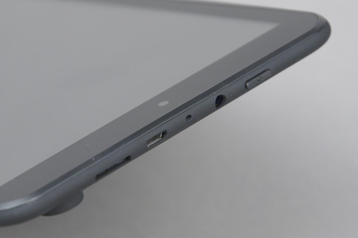 Így nézve a többi csatlakozó (microUSB, fülhallgató ki, microSD) a bal oldalra került, a bekapcsoló gombbal és a mikrofonnal egyetemben. Az USB port a PC-vel való összeköttetés mellett természetesen hostként is működik, az ehhez szükséges adaptert a csomagolás pedig tartalmazza is. A gyári töltő 2,1 amperes áramerősséggel tölt, ami szükséges is ahhoz, hogy a tabletet emberi idő alatt (2 óra alatt) fel tudjuk tölteni. Bár a tablet tölt klasszikus USB portról is, ebben az esetben csak korlátozott használatra számítsunk, mivel a működés több energiát emészt fel, mint amennyit az USB port (vagy egy 1 A-s töltő) szolgáltatni tud.