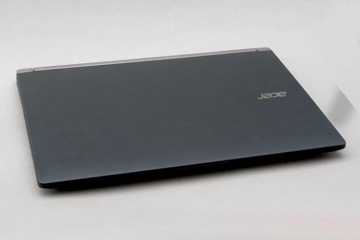 Az Acer gépeit az ultrabook termékcsaládoknál általában igényes anyagválasztás jellemzi, más kategóriákban azonban a költséghatékonyság jegyében a legtöbbször sima műanyagot használ a gyártó, és ez a felfogás a V Nitro sorozatnál is visszaköszön. Szerencsére tesztünk alanya azért nem sima plasztikot kapott, fedlapja (a monitor hátsó része) például textúrázott, amely rögtön elegánsabb megjelenést kölcsönöz a gépnek. És azért meg kell említenünk azt is, hogy a masina megépítésekor azért a fémet sem mellőzték teljesen a gyárban mivel a kijelző alsó része, a gép hátsó része és az összekötő zsanérok borítása alumíniumból készült. A zsanérok szorítása éppen megfelelő, ha nem kell nagyon sietni, akkor a gép akár egy ujjal, az alsó részét nem megtámasztva is kinyitható. A monitort eléggé hátra lehet hajtani, de a 180 fok azért nem elérhető. Kinyitva a gépet már kicsit fapadosabb a helyzet, a monitort körülölelő, elég vastag káva és a klaviatúra alatti rész is teljesen egyszerű (minták és egyéb díszítők nélküli), de legalább a felület mindenhol gumiszerű bevonatot kapott; a belső rész valószínűleg nem lesz dizájndíjas, a funkcionalitásnak viszont mindenben tökéletesen megfelel.