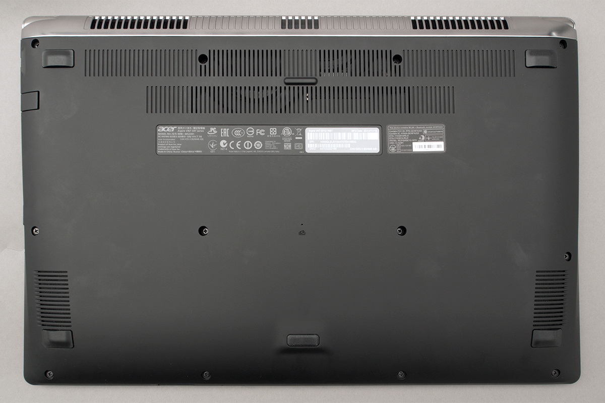 Ha megfordítjuk a gépet, akkor azt látatjuk, hogy nincsenek külön kialakított nyílások a HDD vagy akár a memória cseréjéhez, de erre valószínűleg nem is nagyon lesz szükség, mivel a RAM elég, a tárhely pedig egyszerre nagy és gyors – hogy ezt miként sikerült elérni, arra a következő oldalon térünk vissza. Ha mégis szükség lenne bármelyikre, akkor az minimum a hátlap teljes levételét igényli, rosszabb esetben viszont a gép komolyabb szétszerelésére is készülhetünk – érdemes tehát inkább szerviz segítségét kérni. A hűtési rendszer kialakítása ezúttal (is) jól sikerült, mivel a légkavarók a levegőt az alsó részen szívják be, viszont hátrafelé fújják. És hatékonyan működnek, mivel a notebook, bár alacsony terhelésnél is melegszik, nagyobb terhelésnél sem lesz forró.