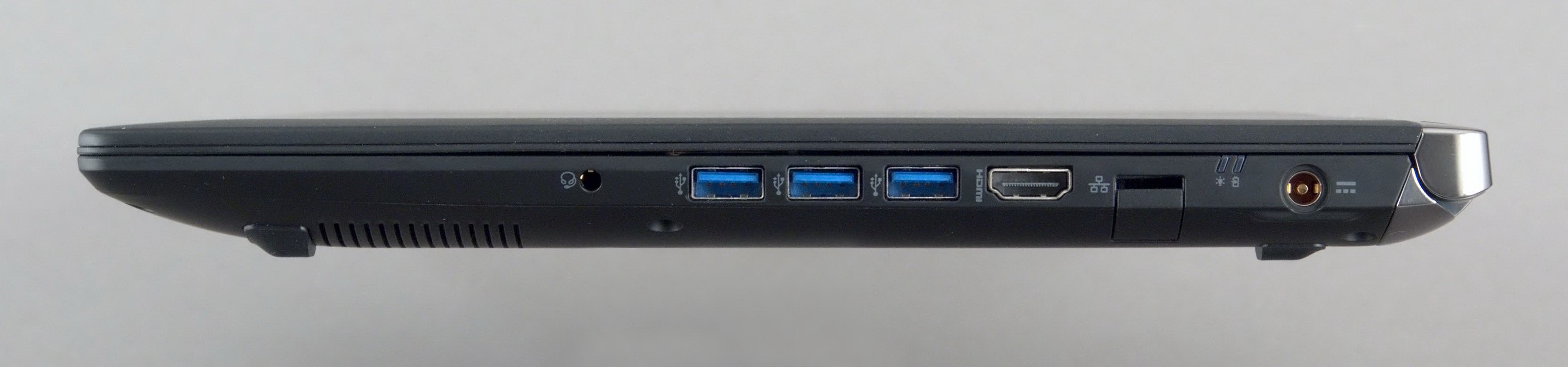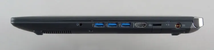 Fentiekből adódóan a hátsó részen nincsenek csatlakozók, viszont a bal oldalon és elöl sem nagyon. Balra csupán a Kensington zár, elöl pedig egy mikrofon és az SD-kártya foglalata található, az érdemi interfészek mindegyike jobbra került. Ez a jobbkezesek számára nem jó hír. A választék többé-kevésbé rendben van, hiszen kapunk 3 USB 3.0 csatlakozót, Ethernet interfészt és HDMI csatlakozót is. Emellett a fülhallgató/mikrofon kombinált dugasza és a tápegység csatlakozója található meg a gépen.