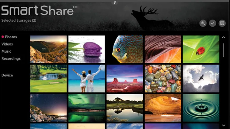 A webOS 2.0-ban a médialejátszó funkcionalitása szinte egyáltalán nem változott, de a program felülete kicsit átalakult: ezeknek a változtatásoknak hála talán valamivel áttekinthetőbb is lett. Forrásként USB-s adattárolót vagy DLNA kiszolgálót is választhatunk. A SmartShare-ben balra a tartalomtípusokat választhatjuk ki, és itt találjuk a keresés funkciót valamint a beállításokat is, jobbra pedig az aktuális mappában lévő (vagy a választásunknak megfelelő) fájlok látszanak. A fejlécben a fájlkezeléssel kapcsolatos lehetőségek jelennek meg (például törlés vagy nézet megváltoztatása).