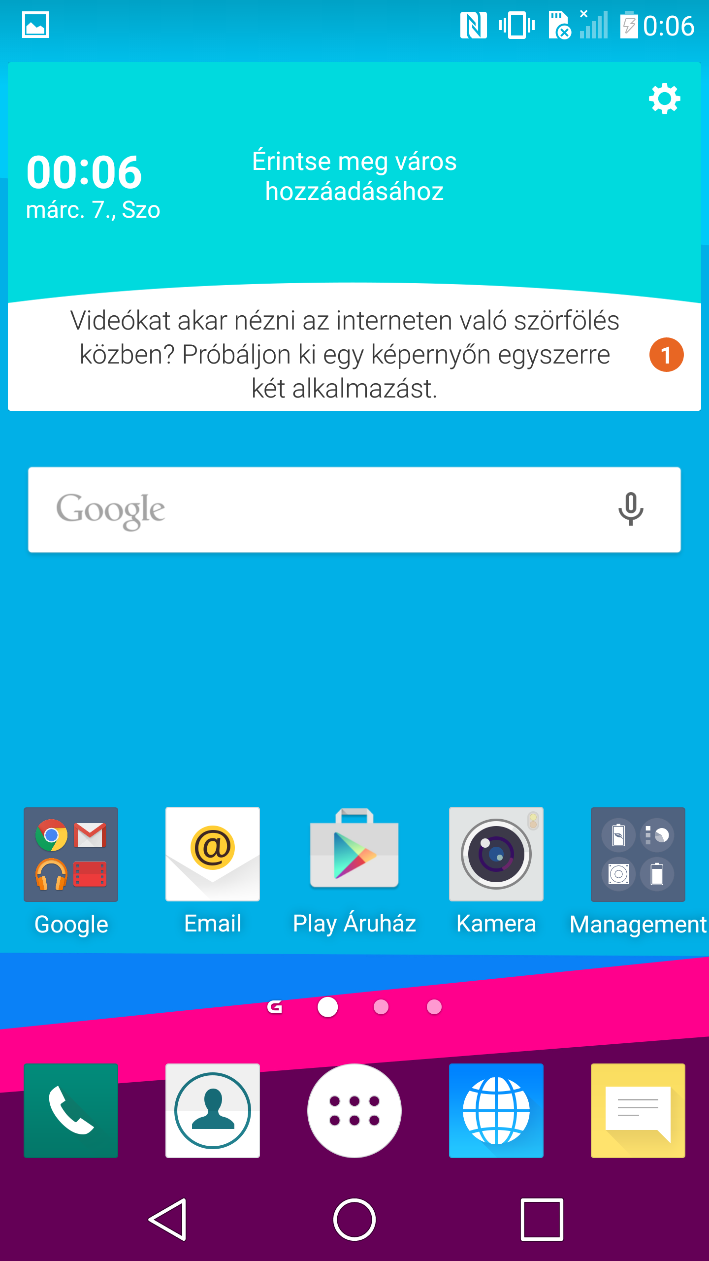 Google fronton a Chrome, a Google, a Hangalapú keresés, a Gmail, a Play Zene, Play Könyvek, Play Újságos és Play Játékok, a Drive, a Fotók, a Hangouts és a YouTube emelendők ki, ez a szett persze nem LG kiváltság, ma már szinte minden Androidos telefonon pontosan ez a leosztás található meg.