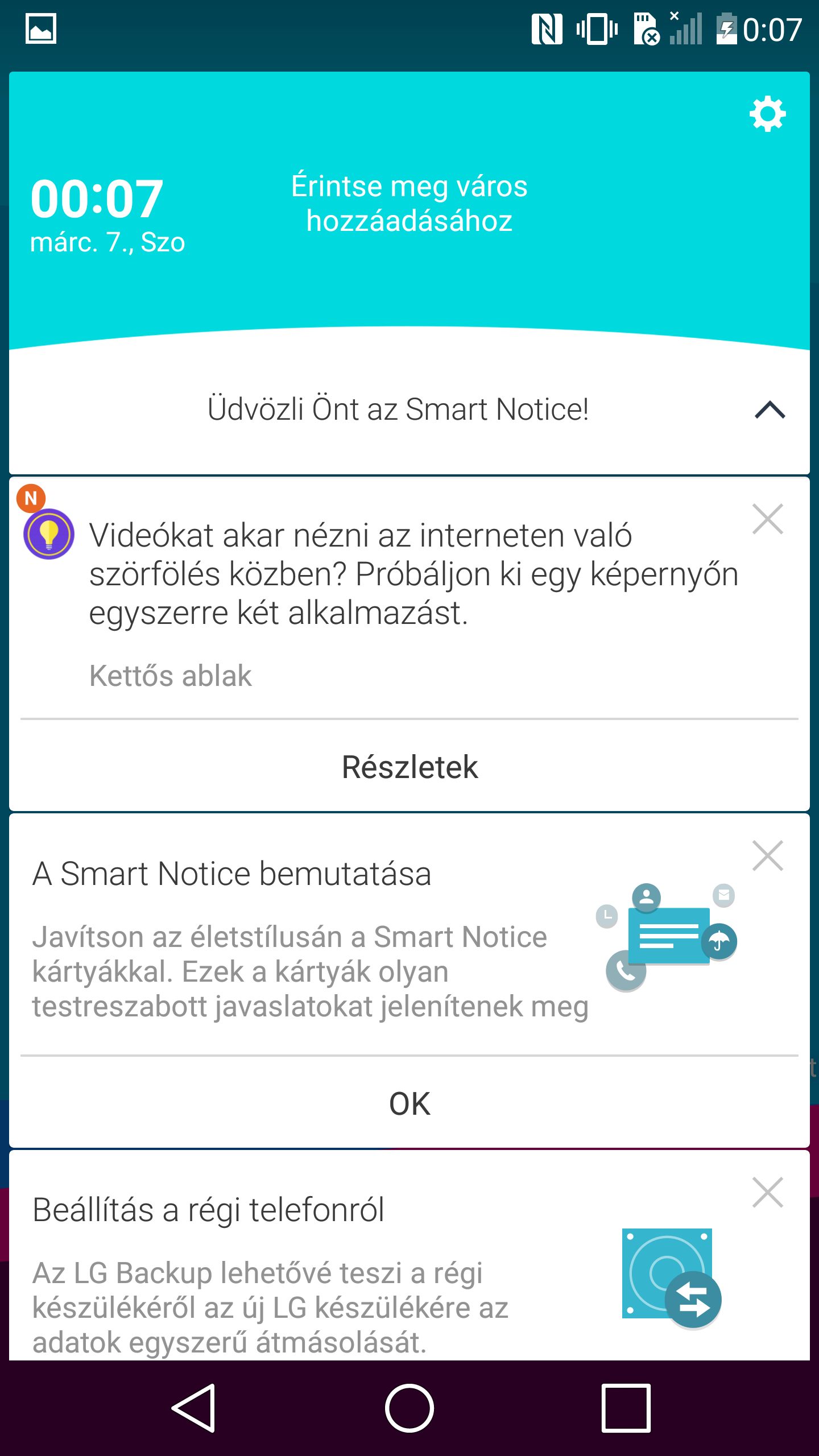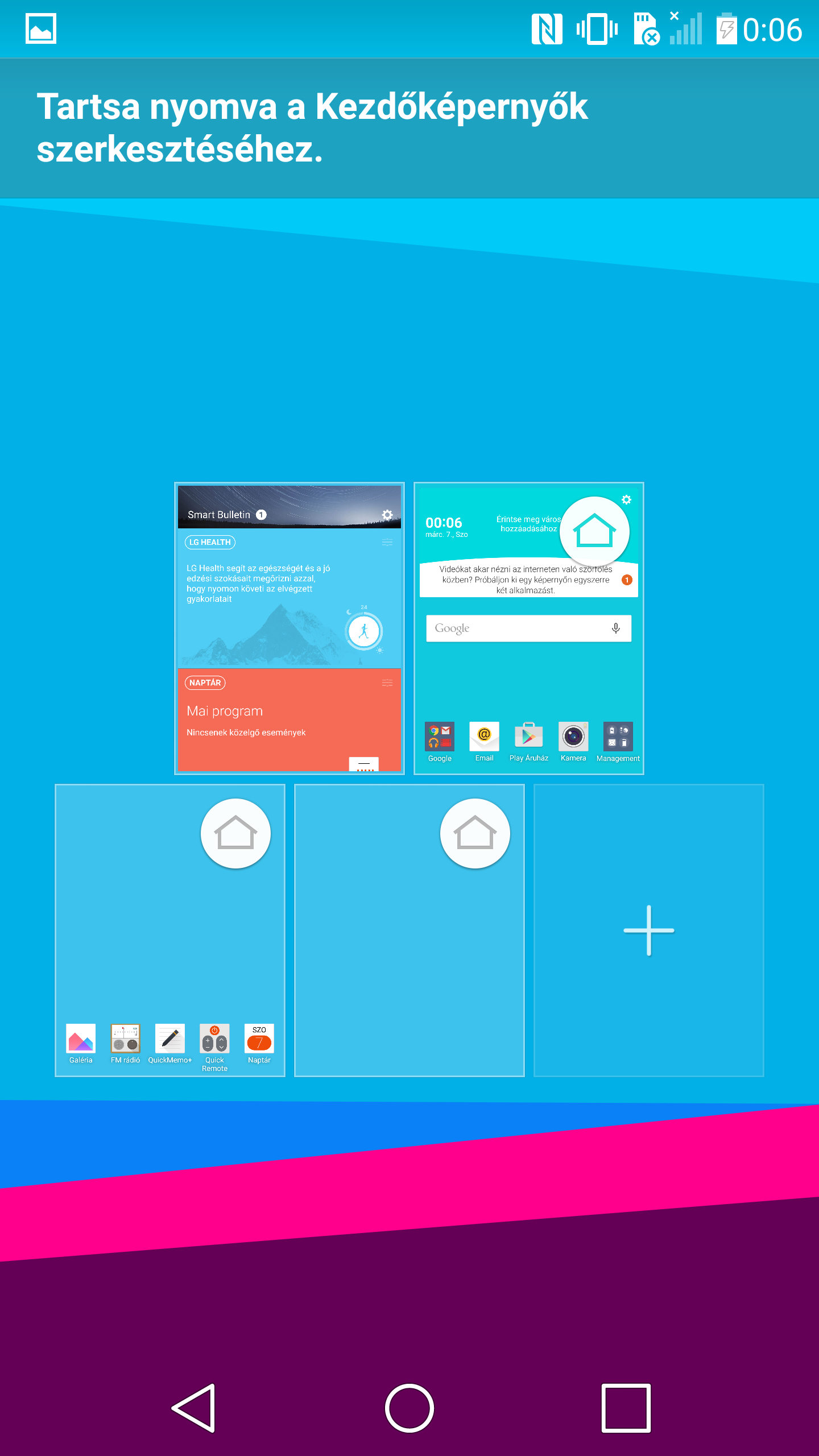Kezdőképernyőből összesen hetet használhatunk, amelyet a „bal oldalon” kiegészít még egy extra panel is, amelyen az LG Health (beépített lépésszámláló és még néhány alapadat) és Smart Tips kártyákat látjuk. Ezek nem is változtathatók, de ha nem kérünk belőlük, akkor az egész felületet ki lehet kapcsolni. Természetesen emellett arra is van mód, hogy letöröljük azokat a kezdőképernyőket, amelyekre éppen nincsen szükségünk.